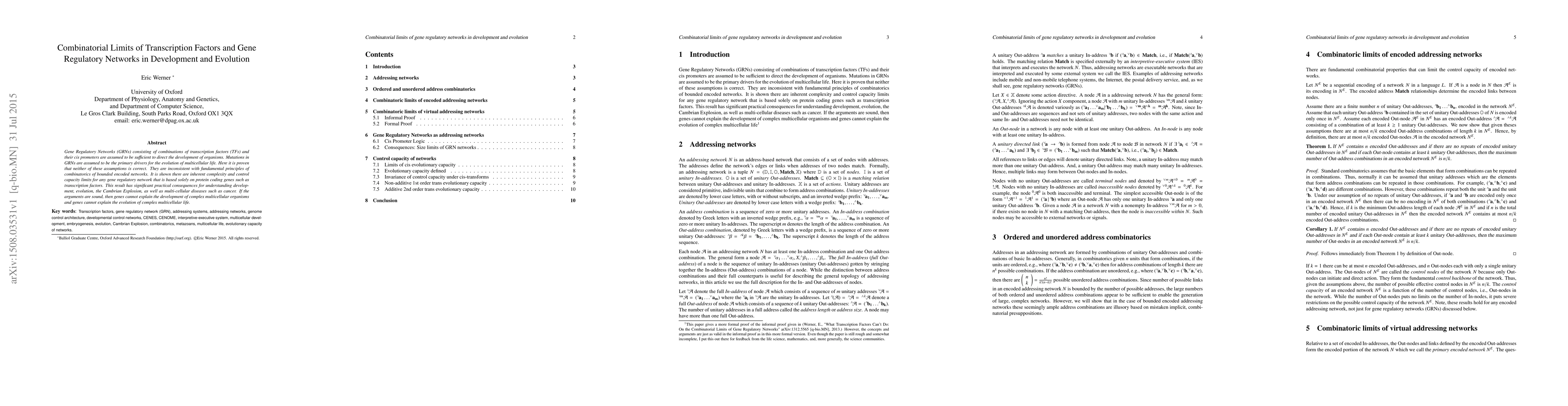 This paper argues that gene regulatory networks, composed of transcription factors and their promoters, cannot fully account for organismal development and evolution due to inherent combinatorial limits, challenging the prevailing assumptions that mutations in these networks are the primary drivers of evolution. The findings suggest significant implications for understanding developmental biology, evolutionary processes, and multi-cellular diseases.