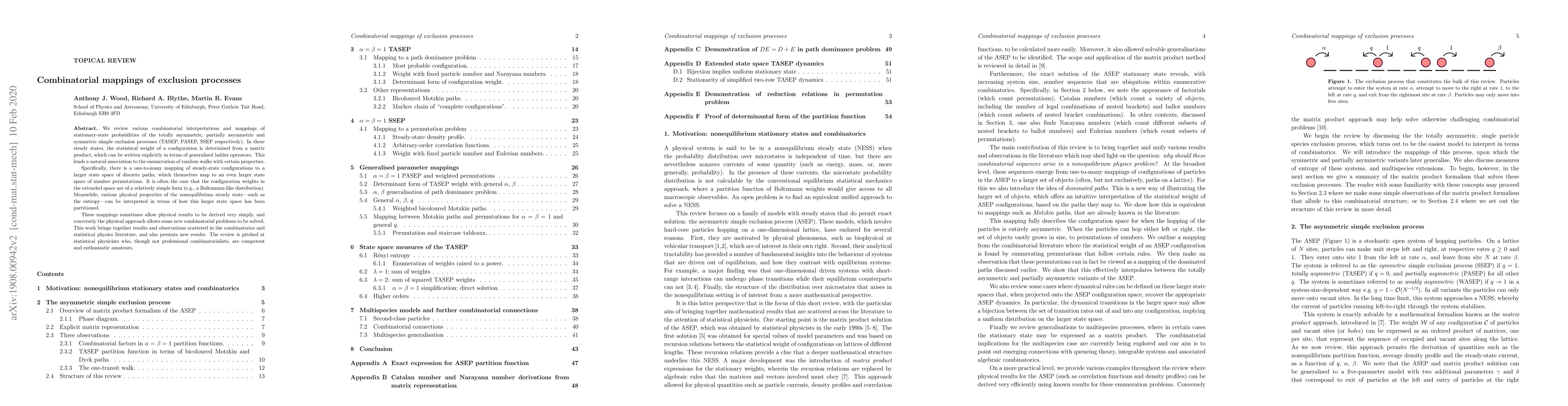 We review various combinatorial interpretations and mappings of stationary-state probabilities of the totally asymmetric, partially asymmetric and symmetric simple exclusion processes (TASEP, PASEP, SSEP respectively). In these steady states, the statistical weight of a configuration is determined from a matrix product, which can be written explicitly in terms of generalised ladder operators. This lends a natural association to the enumeration of random walks with certain properties. Specifically, there is a one-to-many mapping of steady-state configurations to a larger state space of discrete paths, which themselves map to an even larger state space of number permutations. It is often the case that the configuration weights in the extended space are of a relatively simple form (e.g., a Boltzmann-like distribution). Meanwhile, various physical properties of the nonequilibrium steady state - such as the entropy - can be interpreted in terms of how this larger state space has been partitioned. These mappings sometimes allow physical results to be derived very simply, and conversely the physical approach allows some new combinatorial problems to be solved. This work brings together results and observations scattered in the combinatorics and statistical physics literature, and also presents new results. The review is pitched at statistical physicists who, though not professional combinatorialists, are competent and enthusiastic amateurs.