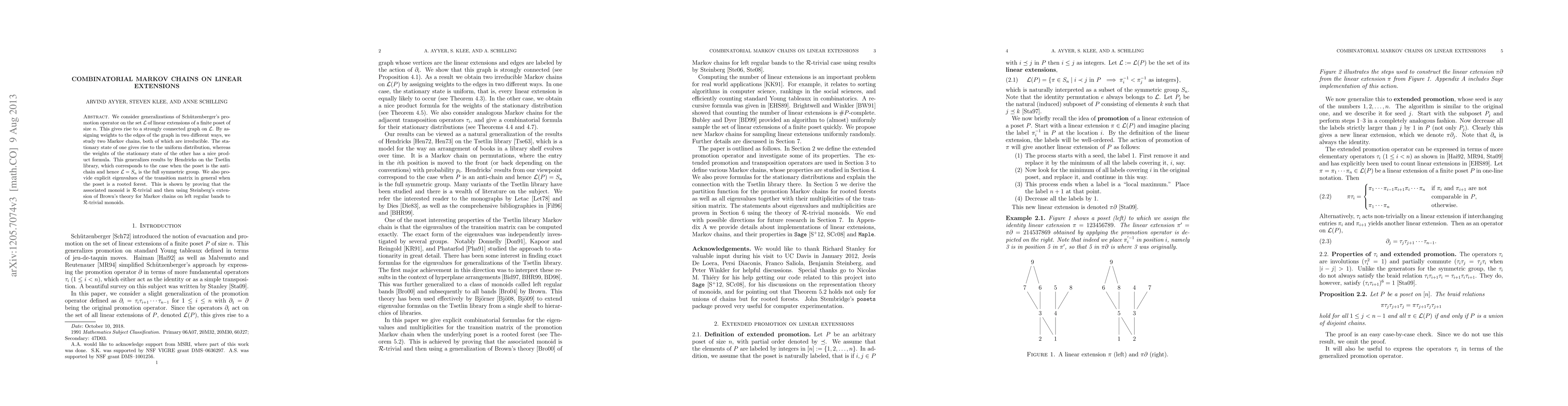We consider generalizations of Schuetzenberger's promotion operator on the set L of linear extensions of a finite poset of size n. This gives rise to a strongly connected graph on L. By assigning weights to the edges of the graph in two different ways, we study two Markov chains, both of which are irreducible. The stationary state of one gives rise to the uniform distribution, whereas the weights of the stationary state of the other has a nice product formula. This generalizes results by Hendricks on the Tsetlin library, which corresponds to the case when the poset is the anti-chain and hence L=S_n is the full symmetric group. We also provide explicit eigenvalues of the transition matrix in general when the poset is a rooted forest. This is shown by proving that the associated monoid is R-trivial and then using Steinberg's extension of Brown's theory for Markov chains on left regular bands to R-trivial monoids.