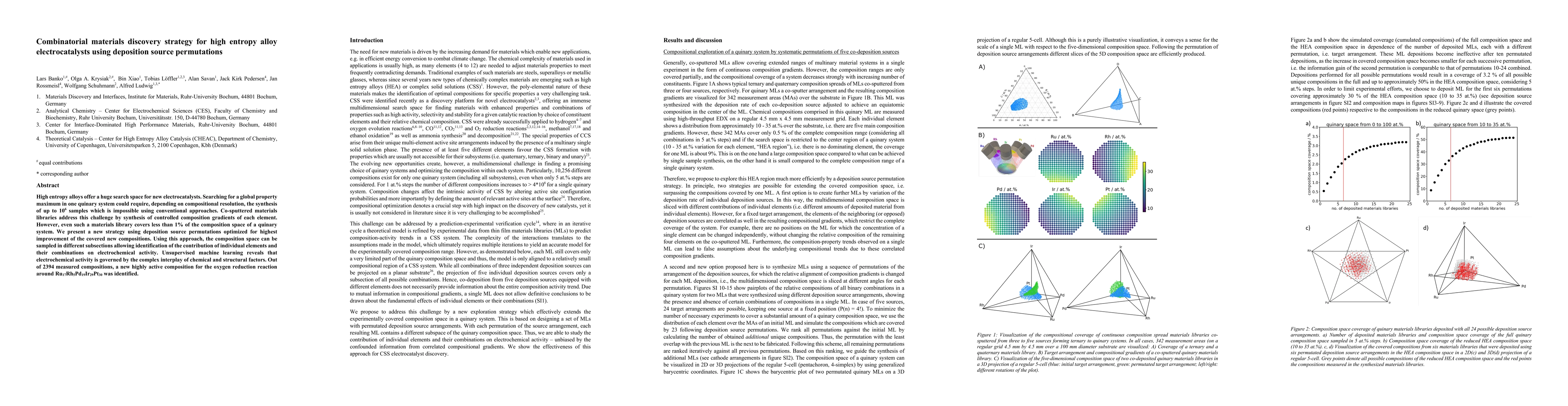 High entropy alloys offer a huge search space for new electrocatalysts. Searching for a global property maximum in one quinary system could require, depending on compositional resolution, the synthesis of up to 10E6 samples which is impossible using conventional approaches. Co-sputtered materials libraries address this challenge by synthesis of controlled composition gradients of each element. However, even such a materials library covers less than 1% of the composition space of a quinary system. We present a new strategy using deposition source permutations optimized for highest improvement of the covered new compositions. Using this approach, the composition space can be sampled in different subsections allowing identification of the contribution of individual elements and their combinations on electrochemical activity. Unsupervised machine learning reveals that electrochemical activity is governed by the complex interplay of chemical and structural factors. Out of 2394 measured compositions, a new highly active composition for the oxygen reduction reaction around Ru17Rh5Pd19Ir29Pt30 was identified.