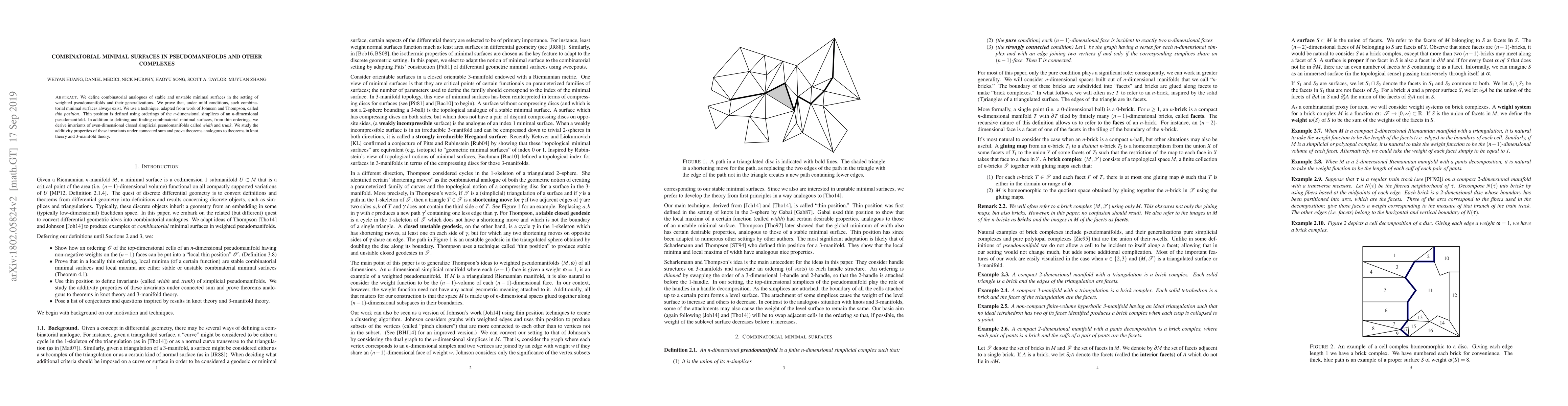 We define combinatorial analogues of stable and unstable minimal surfaces in the setting of weighted pseudomanifolds. We prove that, under mild conditions, such combinatorial minimal surfaces always exist. We use a technique, adapted from work of Johnson and Thompson, called thin position. Thin position is defined using orderings of the cells of a pseudomanifold. In addition to defining and finding combinatorial minimal surfaces, from thin orderings, we derive invariants of even-dimensional closed simplicial pseudomanifolds called width and trunk. We study additivity properties of these invariants under connected sum and prove theorems analogous to those in knot theory and 3-manifold theory.