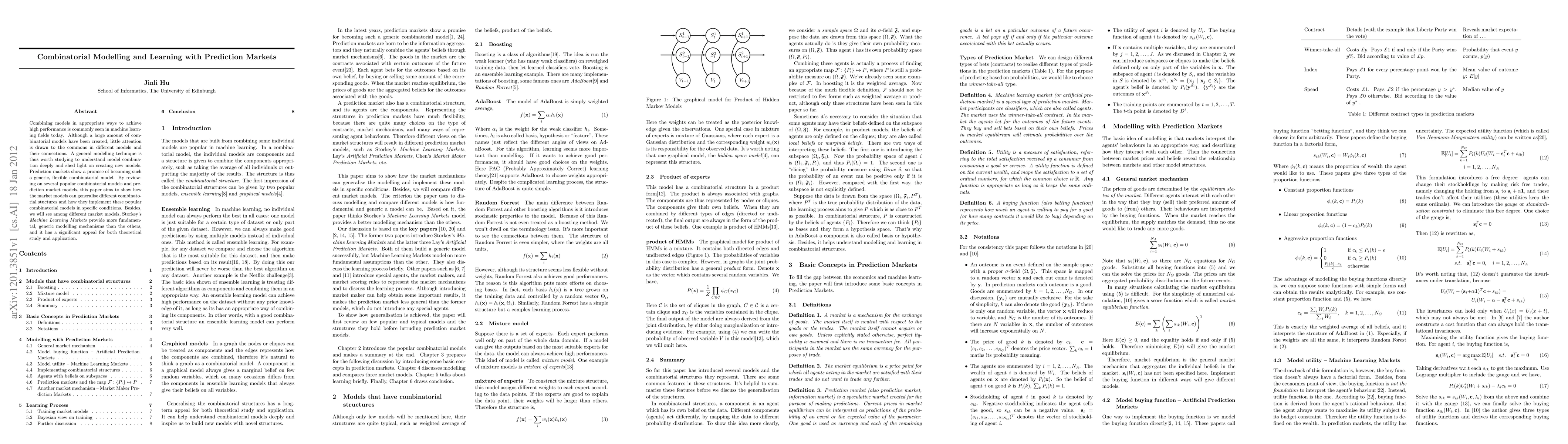 Combining models in appropriate ways to achieve high performance is commonly seen in machine learning fields today. Although a large amount of combinatorial models have been created, little attention is drawn to the commons in different models and their connections. A general modelling technique is thus worth studying to understand model combination deeply and shed light on creating new models. Prediction markets show a promise of becoming such a generic, flexible combinatorial model. By reviewing on several popular combinatorial models and prediction market models, this paper aims to show how the market models can generalise different combinatorial stuctures and how they implement these popular combinatorial models in specific conditions. Besides, we will see among different market models, Storkey's \emph{Machine Learning Markets} provide more fundamental, generic modelling mechanisms than the others, and it has a significant appeal for both theoretical study and application.