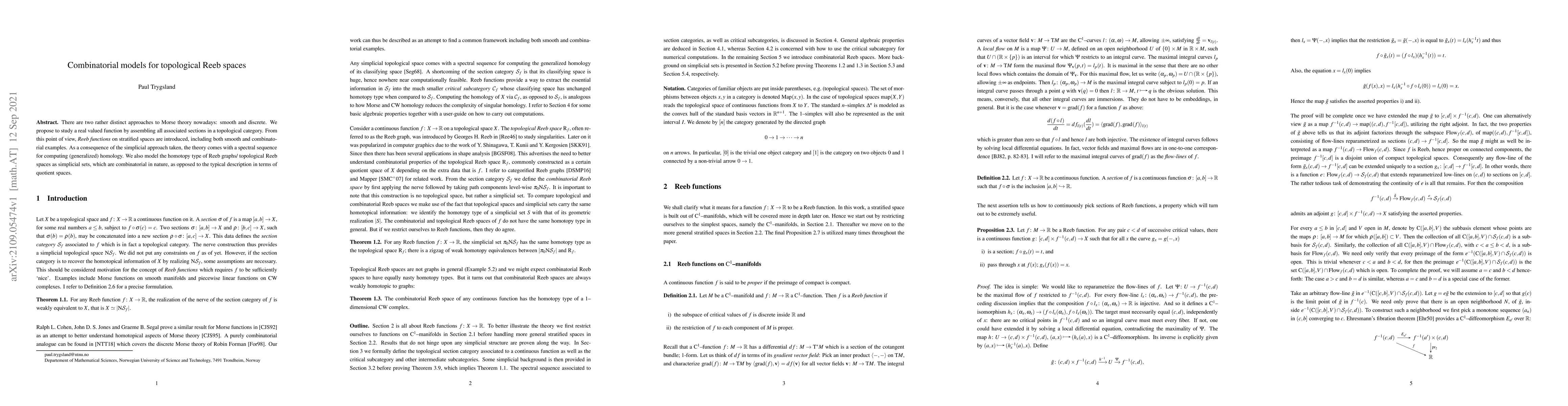 There are two rather distinct approaches to Morse theory nowadays: smooth and discrete. We propose to study a real valued function by assembling all associated sections in a topological category. From this point of view, Reeb functions on stratified spaces are introduced, including both smooth and combinatorial examples. As a consequence of the simplicial approach taken, the theory comes with a spectral sequence for computing (generalized) homology. We also model the homotopy type of Reeb graphs/ topological Reeb spaces as simplicial sets, which are combinatorial in nature, as opposed to the typical description in terms of quotient spaces.