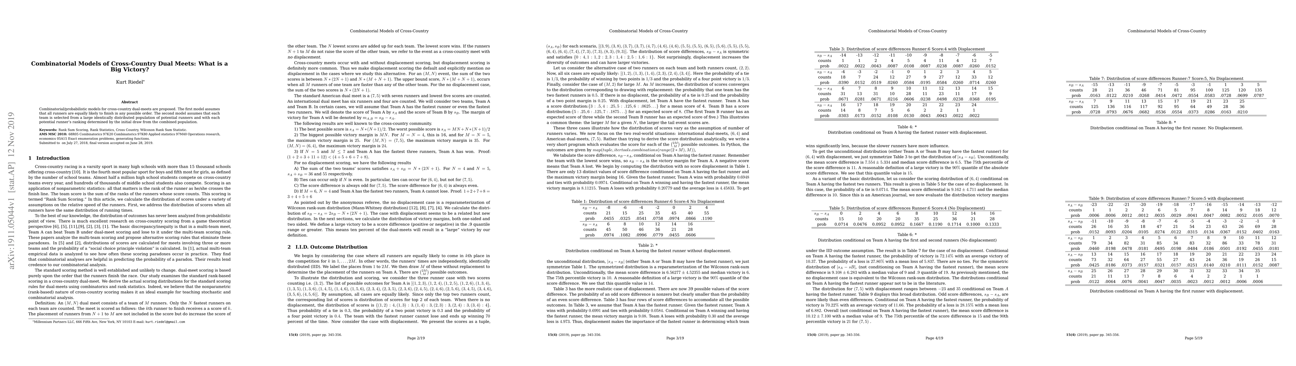 Researchers propose two combinatorial models for predicting outcomes in cross-country dual meets, one assuming equal likelihood of finish order and the other based on a large population of potential runners.