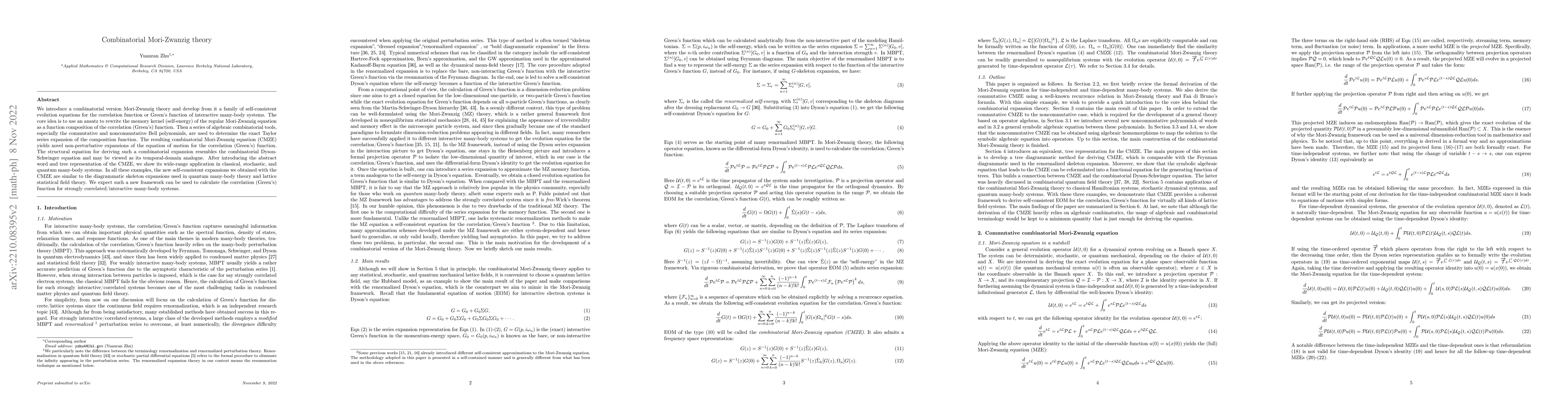 This paper introduces a combinatorial Mori-Zwanzig theory that reformulates the memory kernel as a function composition of the correlation function, employing combinatorial tools to derive self-consistent evolution equations. The resulting combinatorial Mori-Zwanzig equation provides novel non-perturbative expansions applicable to classical, stochastic, and quantum many-body systems.