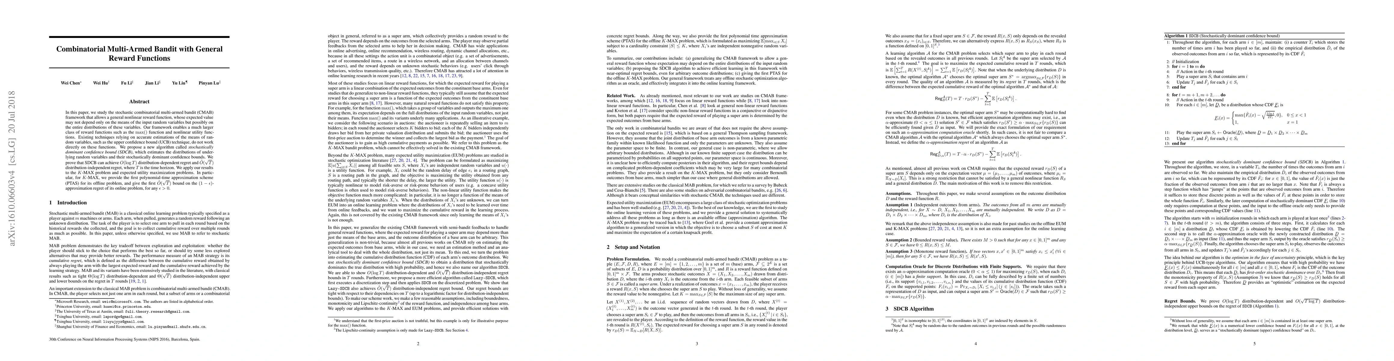 This paper introduces a new algorithm for combinatorial multi-armed bandits that can handle general nonlinear reward functions, achieving $O( ext{log}(T))$ distribution-dependent regret and $ ilde{O}( ext{sqrt}(T))$ distribution-independent regret.