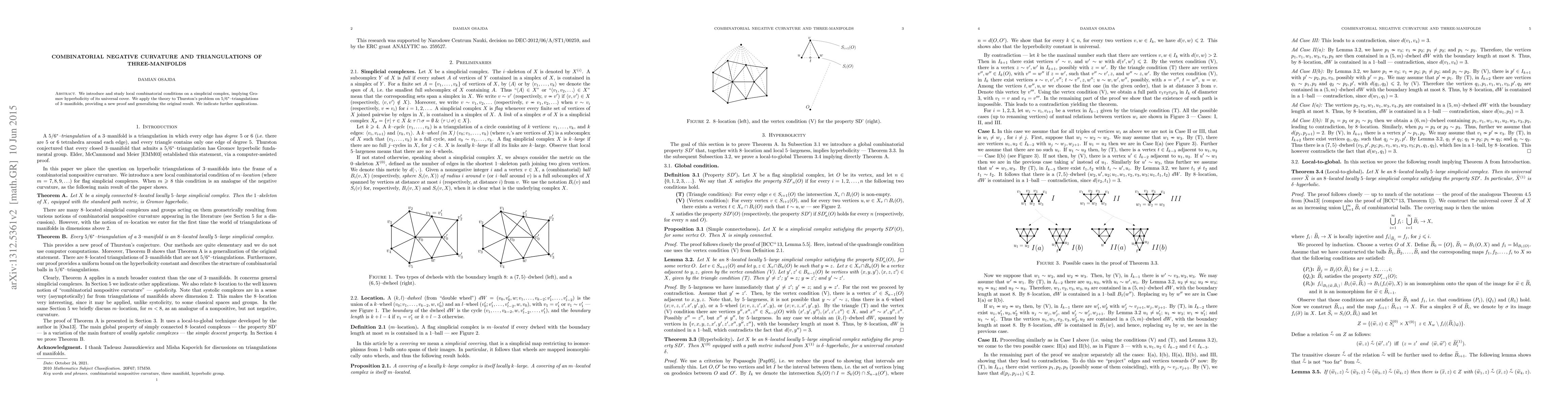 We introduce and study local combinatorial conditions on a simplicial complex, implying Gromov hyperbolicity of its universal cover. We apply the theory to Thurston's problem on 5/6*-triangulations of 3-manifolds, providing a new proof and generalizing the original result. We indicate further applications.