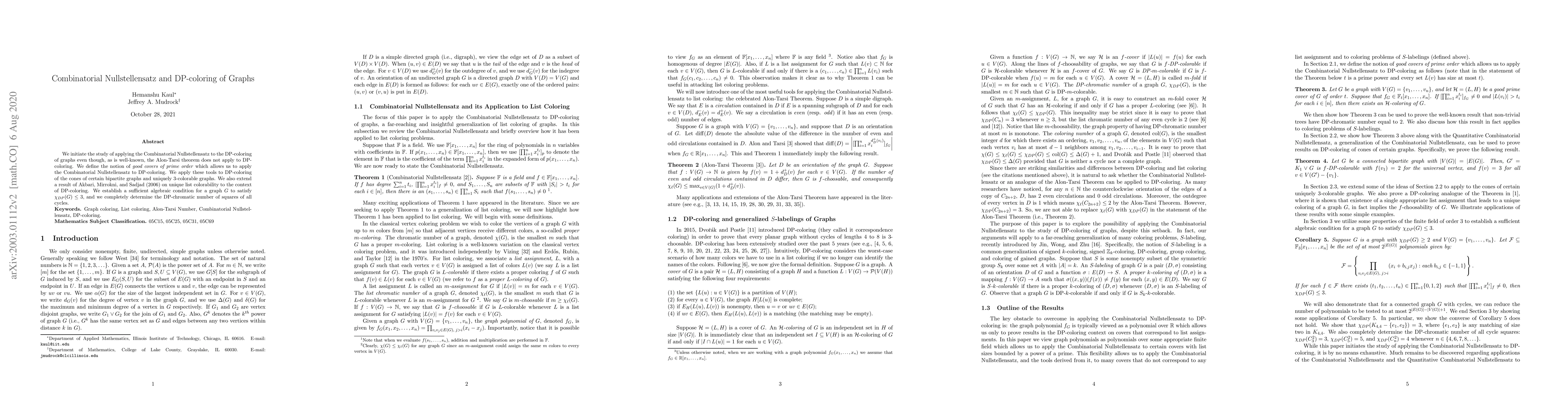 This paper explores the application of the Combinatorial Nullstellensatz to DP-coloring of graphs, defining good covers of prime order to extend its applicability. It determines the DP-chromatic number of squares of cycles and establishes a sufficient algebraic condition for graphs with $\chi_{DP}(G) \leq 3$.