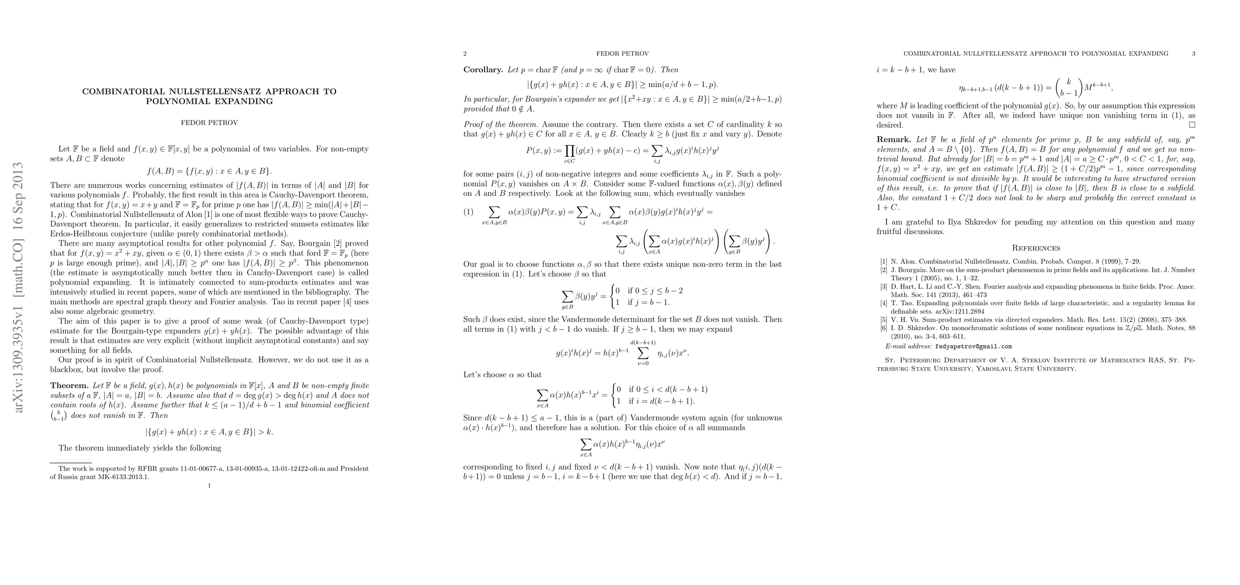 This paper utilizes Combinatorial Nullstellensatz techniques to establish a lower bound for the absolute value of a polynomial $f(A,B)$ where $f(x,y)$ is structured as $g(x)+yh(x)$ with the degree of $g$ exceeding that of $h$, for finite subsets $A$ and $B$ of a field.