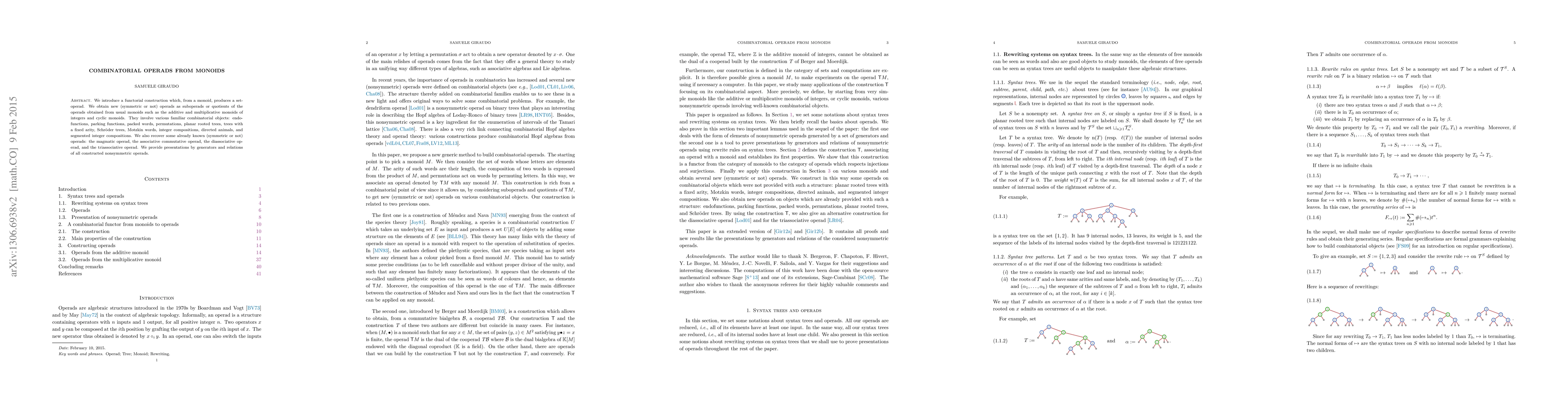 This paper constructs a functorial method to generate set-operads from monoids, yielding new combinatorial operads as suboperads or quotients, and involving familiar objects like endofunctions and planar trees. It also recovers known operads and provides presentations for nonsymmetric operads.