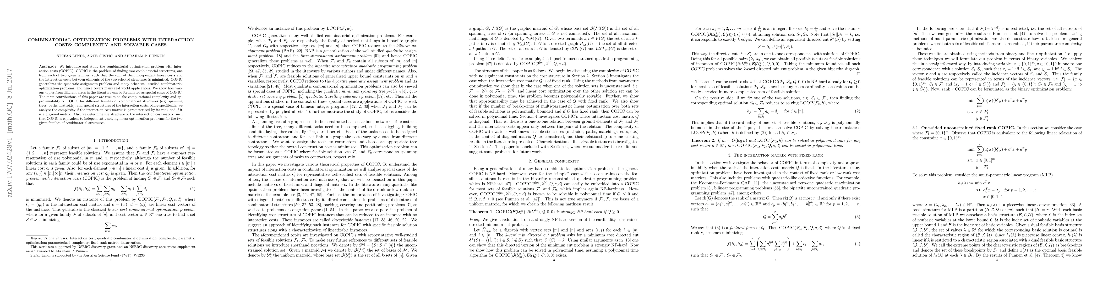 This paper studies the combinatorial optimization problem with interaction costs (COPIC), which seeks to minimize the sum of independent linear costs and interaction costs between selected structures from two given families. The authors analyze the complexity and approximability of COPIC under various structural constraints and special forms of interaction costs, including diagonal and rank-parameterized matrices.