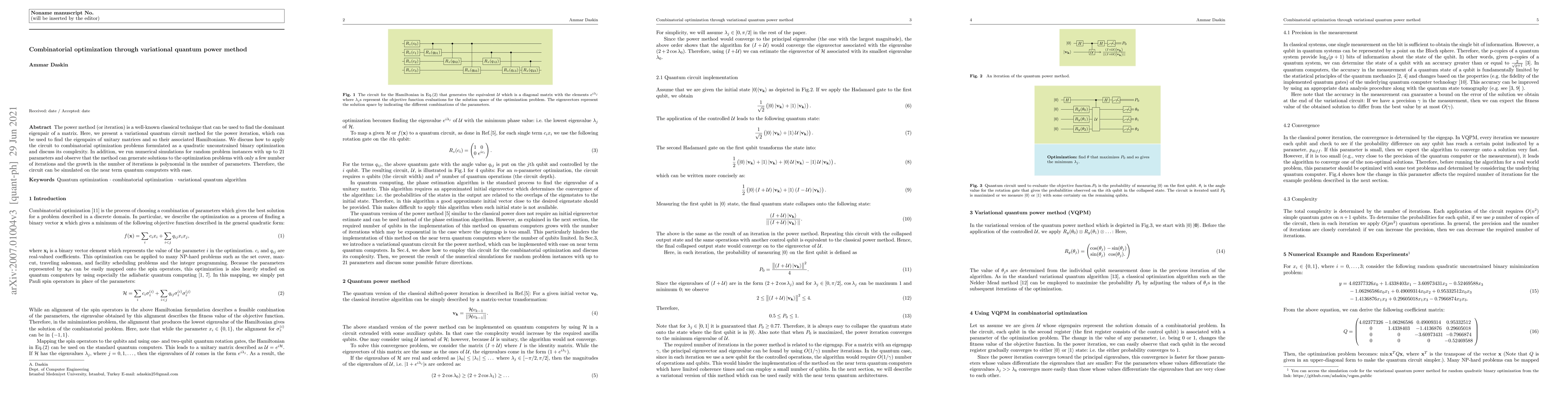 The power method (or iteration) is a well-known classical technique that can be used to find the dominant eigenpair of a matrix. Here, we present a variational quantum circuit method for the power iteration, which can be used to find the eigenpairs of unitary matrices and so their associated Hamiltonians. We discuss how to apply the circuit to combinatorial optimization problems formulated as a quadratic unconstrained binary optimization and discuss its complexity. In addition, we run numerical simulations for random problem instances with up to 21 parameters and observe that the method can generate solutions to the optimization problems with only a few number of iterations and the growth in the number of iterations is polynomial in the number of parameters. Therefore, the circuit can be simulated on the near term quantum computers with ease.
