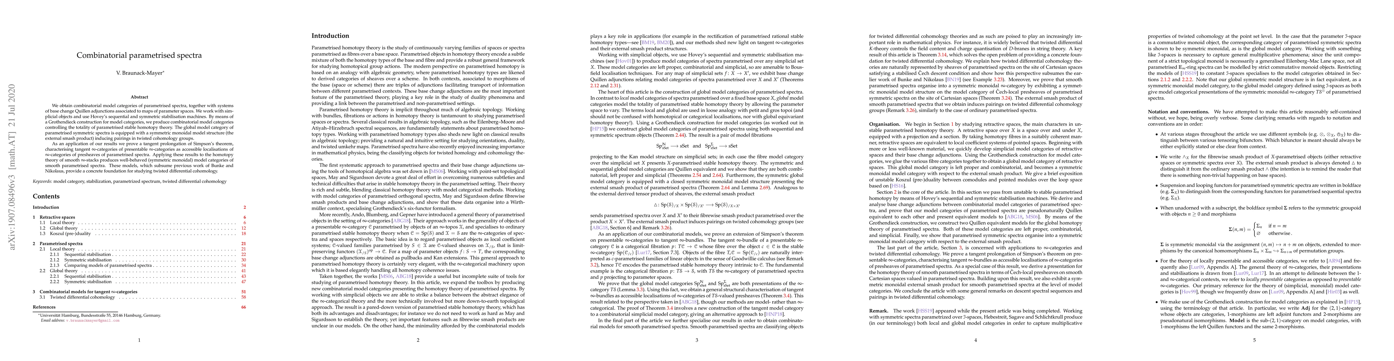 This paper develops combinatorial model categories for parametrised spectra and establishes Quillen adjunctions for maps of parameter spaces, using Hovey's stabilisation techniques. It also proves a tangent prolongation of Simpson's theorem and constructs well-behaved model categories for smooth parametrised spectra, facilitating the study of twisted differential cohomology.