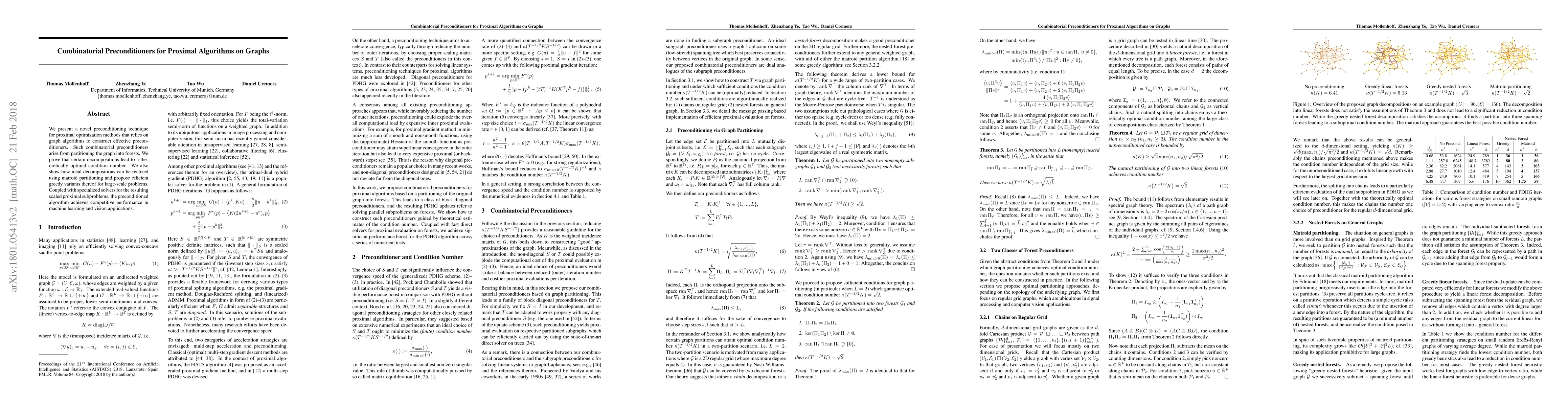 This research introduces a new preconditioning method for proximal optimization techniques, leveraging graph algorithms to create effective preconditioners via graph partitioning into forests. It proves theoretically optimal condition numbers for specific decompositions, suggests using matroid partitioning for ideal decompositions, and proposes efficient greedy variants for large-scale issues. The method, when combined with tailored solvers for scaled proximal subproblems, demonstrates competitive performance in machine learning and vision tasks.