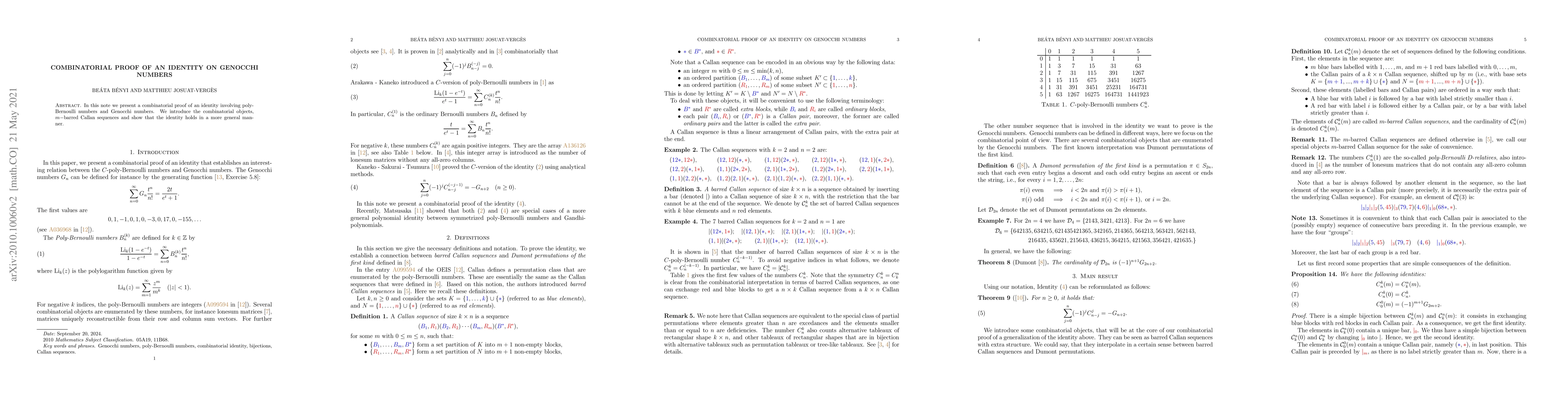 Title: Combinatorial proof of an identity on Genocchi numbers Summary: This paper provides a combinatorial proof for an identity connecting poly-Bernoulli numbers and Genocchi numbers using $m$-barred Callan sequences, demonstrating its broader applicability.