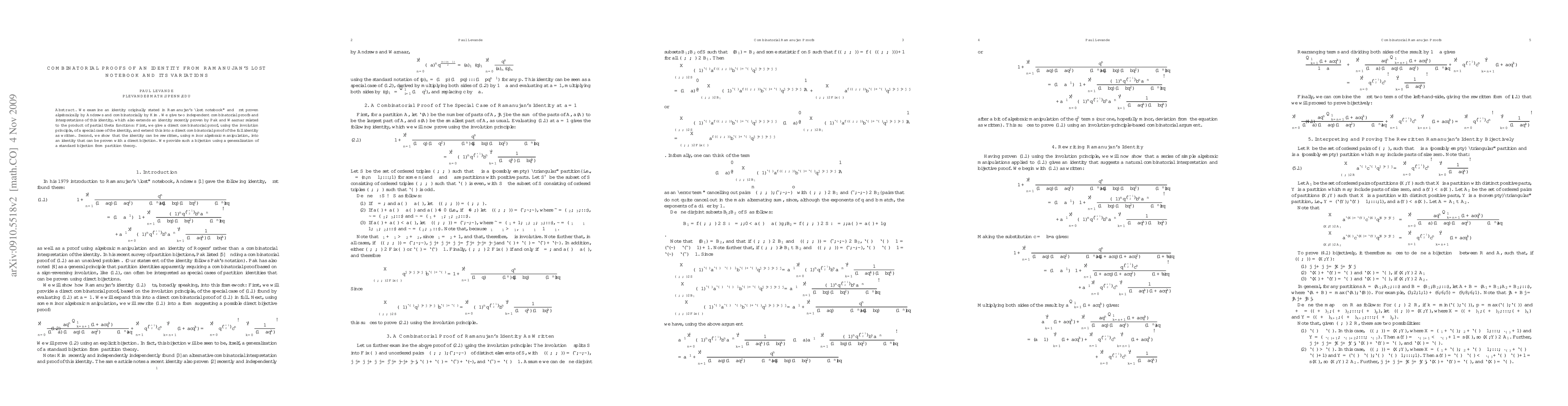 This paper presents two independent combinatorial proofs for an identity from Ramanujan's "lost notebook," extending it to related identities. It uses the involution principle for a special case and a generalized bijection from partition theory for the full identity.