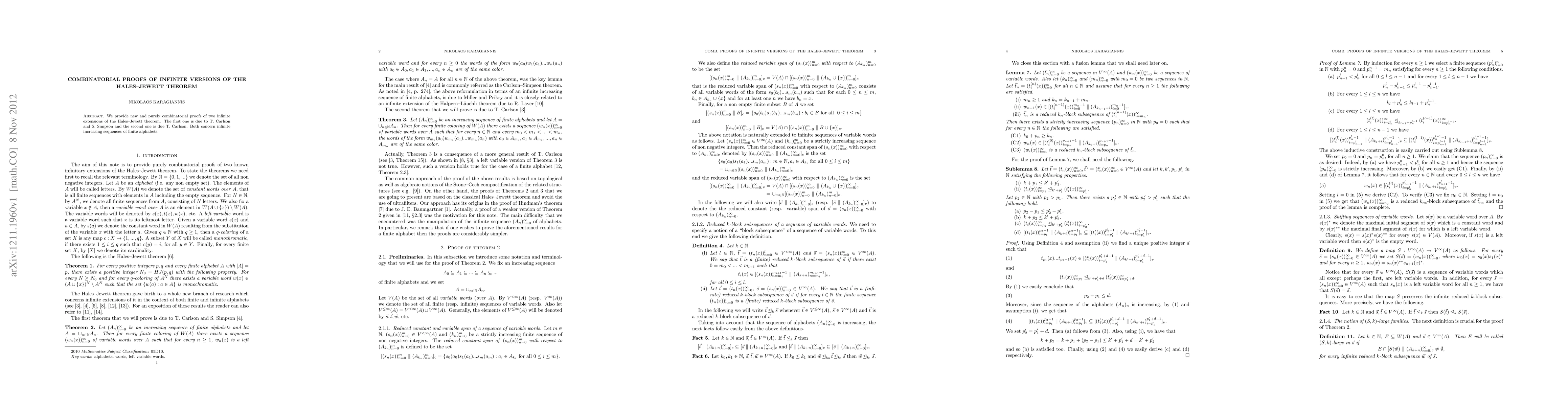 This paper presents novel combinatorial proofs for two infinite versions of the Hales-Jewett theorem, one by T. Carlson and S. Simpson, and another by T. Carlson, focusing on infinite sequences within finite alphabets.