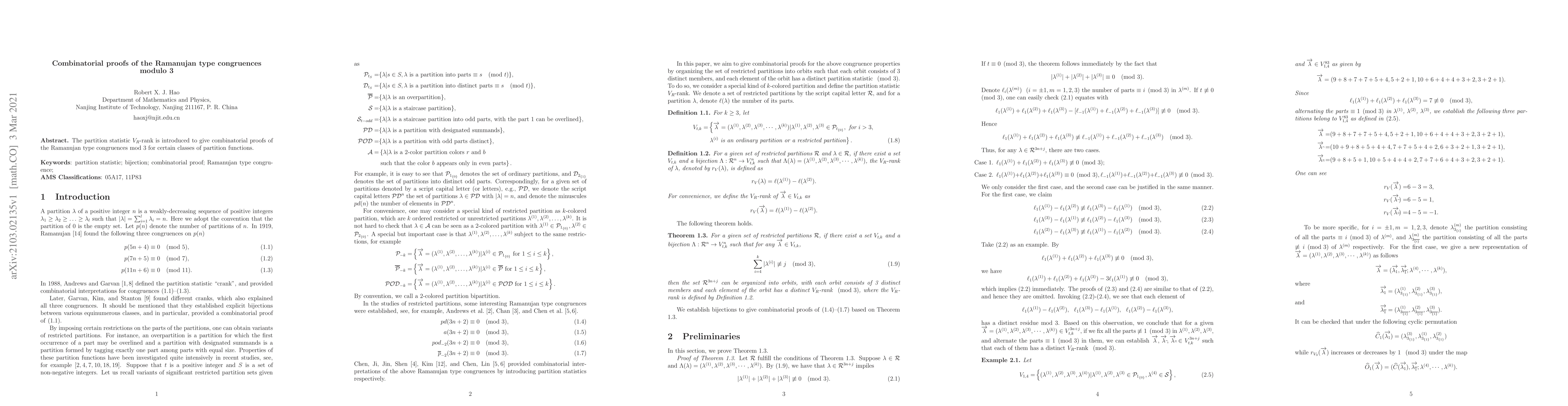 The partition statistic $V_R$-rank is introduced to give combinatorial proofs of the Ramanujan type congruences mod 3 for certain classes of partition functions.