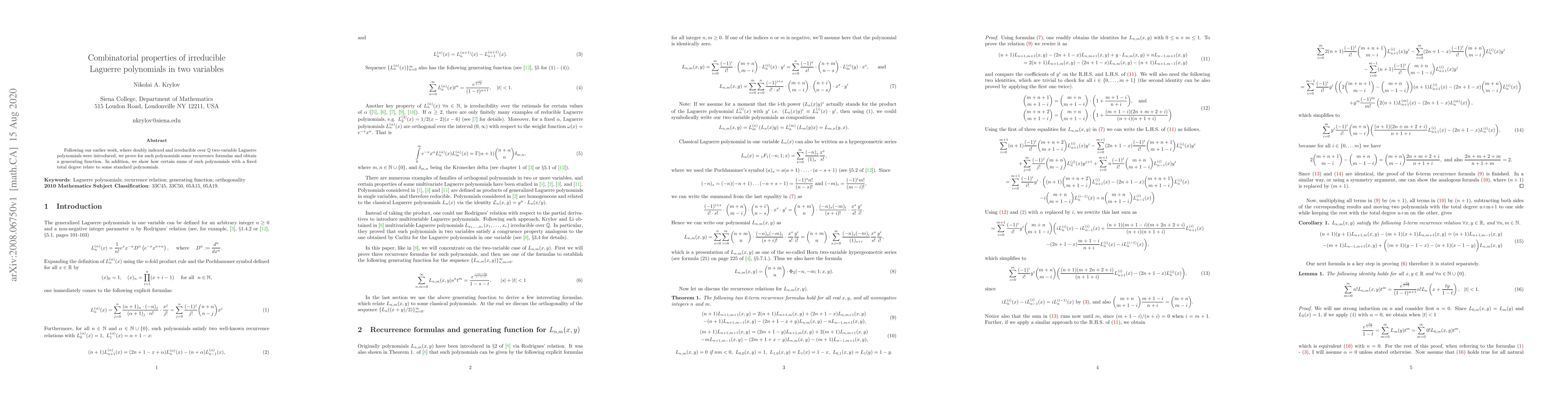 Following our earlier work, where doubly indexed and irreducible over Q two-variable Laguerre polynomials were introduced, we prove for such polynomials some recurrence formulas and obtain a generating function. In addition, we show how certain sums of such polynomials with a fixed total degree relate to some standard polynomials.