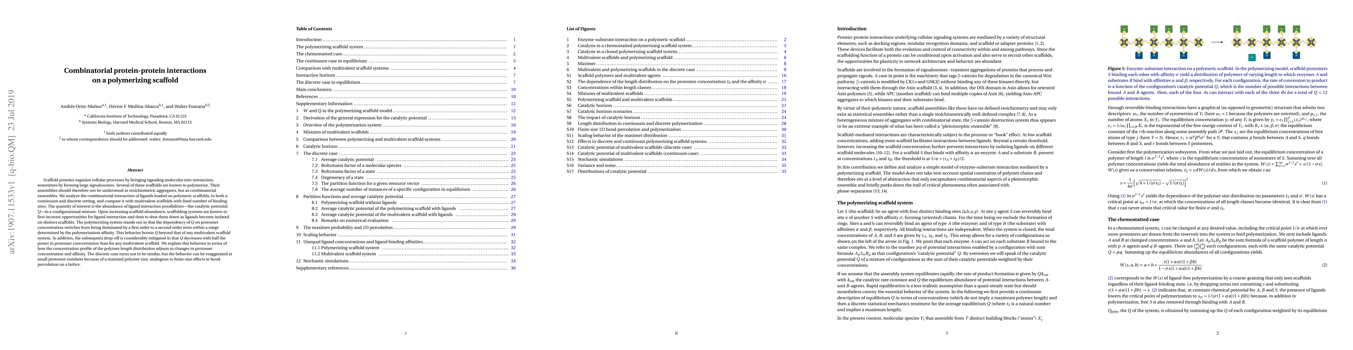 The paper presents a detailed mathematical model and analysis of combinatorial protein-protein interactions on polymerizing scaffolds, comparing it with multivalent scaffold systems, and deriving expressions for catalytic potential in both continuum and discrete settings.