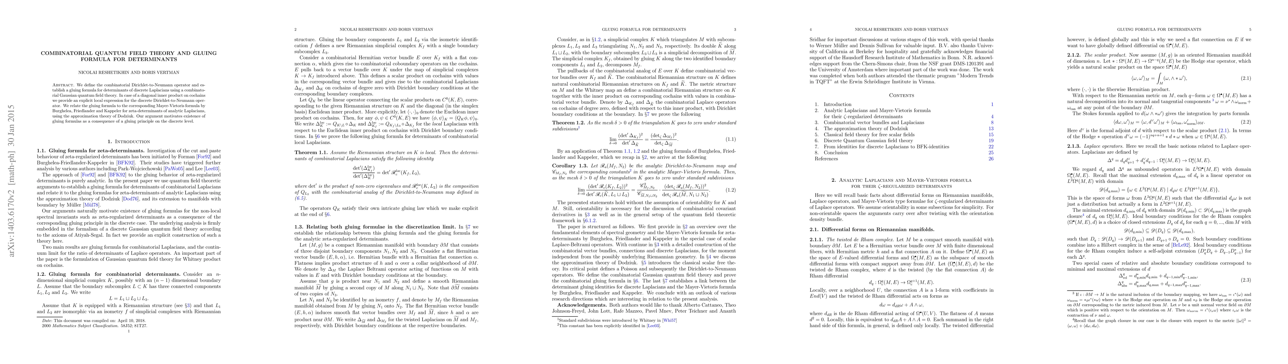 This paper defines a combinatorial Dirichlet-to-Neumann operator and establishes a gluing formula for determinants of discrete Laplacians through combinatorial Gaussian quantum field theory, relating it to the Mayer-Vietoris formula for analytic Laplacians via Dodziuk's approximation theory.