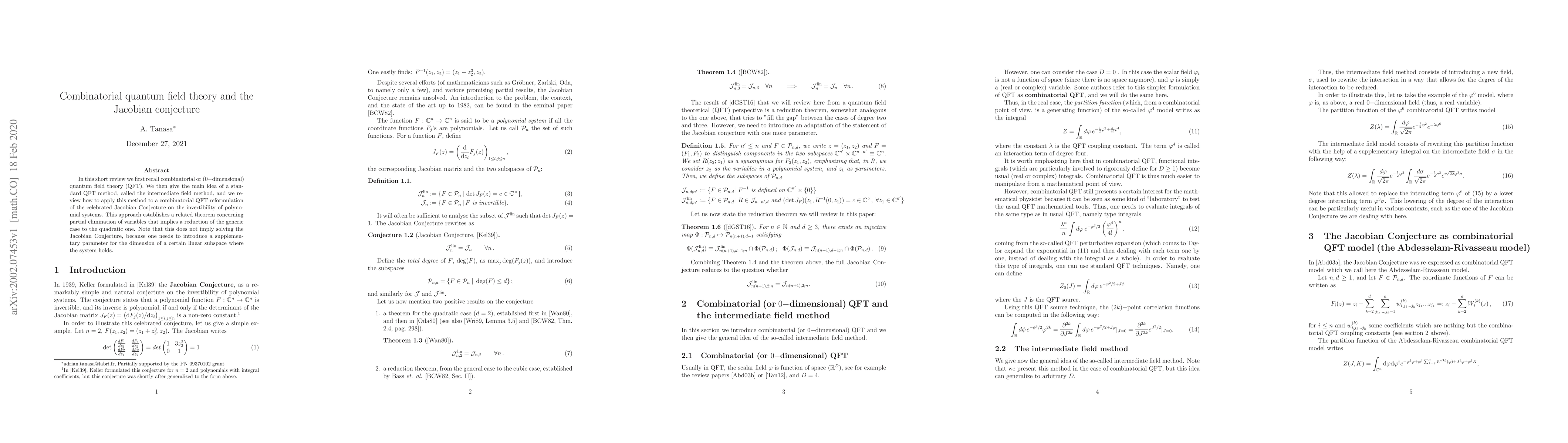 In this short review we first recall combinatorial or ($0-$dimensional) quantum field theory (QFT). We then give the main idea of a standard QFT method, called the intermediate field method, and we review how to apply this method to a combinatorial QFT reformulation of the celebrated Jacobian conjecture on the invertibility of polynomial systems. This approach establishes a related theorem concerning partial elimination of variables that implies a reduction of the generic case to the quadratic one. Note that this does not imply solving the Jacobian conjecture, because one needs to introduce a supplementary parameter for the dimension of a certain linear subspace where the system holds.