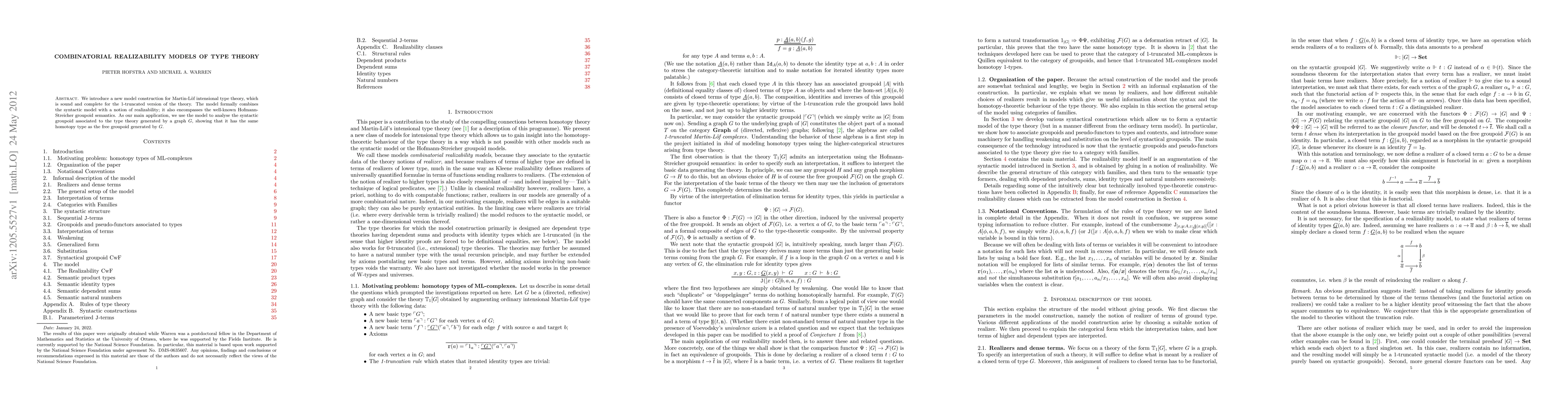 This paper presents a novel model for Martin-Löf intensional type theory, combining syntactic and realizability aspects, and demonstrates its application in showing that the syntactic groupoid associated with type theory from a graph G has the same homotopy type as the free groupoid generated by G.