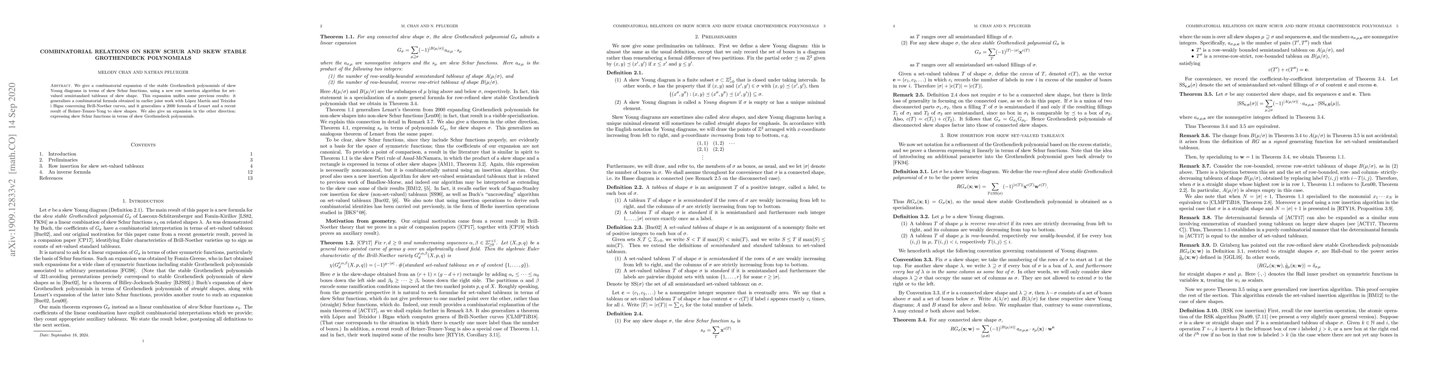 This paper provides a combinatorial expansion of stable Grothendieck polynomials for skew Young diagrams in terms of skew Schur functions, employing a novel row insertion algorithm for semistandard tableaux. It unifies prior results from Brill-Noether curves and extends formulas from earlier works on skew shapes.