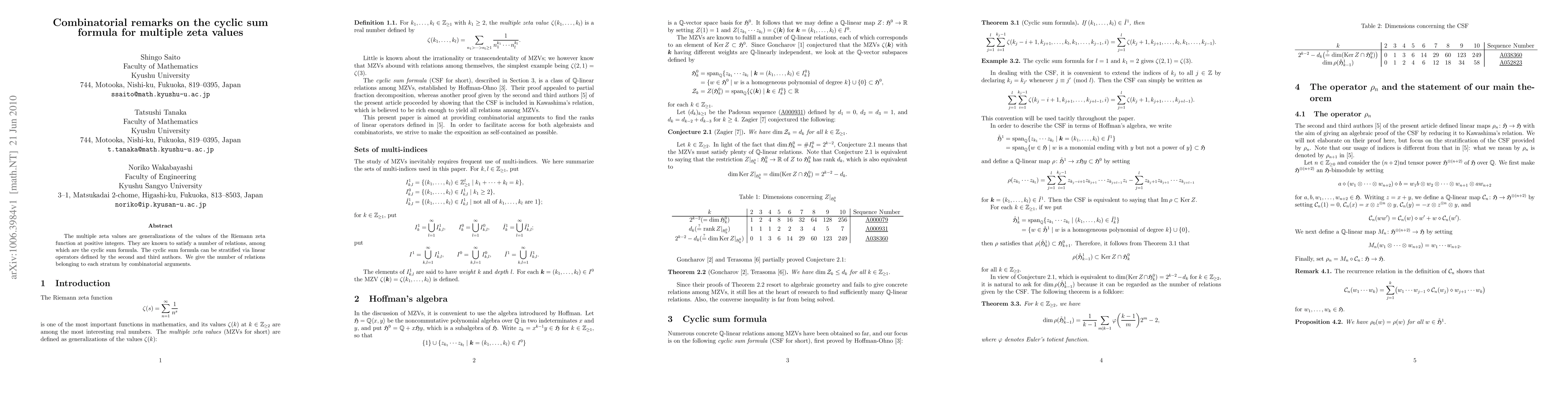 This paper investigates the cyclic sum formula for multiple zeta values, providing a combinatorial analysis to count the number of relations within each stratum defined by linear operators. The focus is on understanding the structure and distribution of these relations.