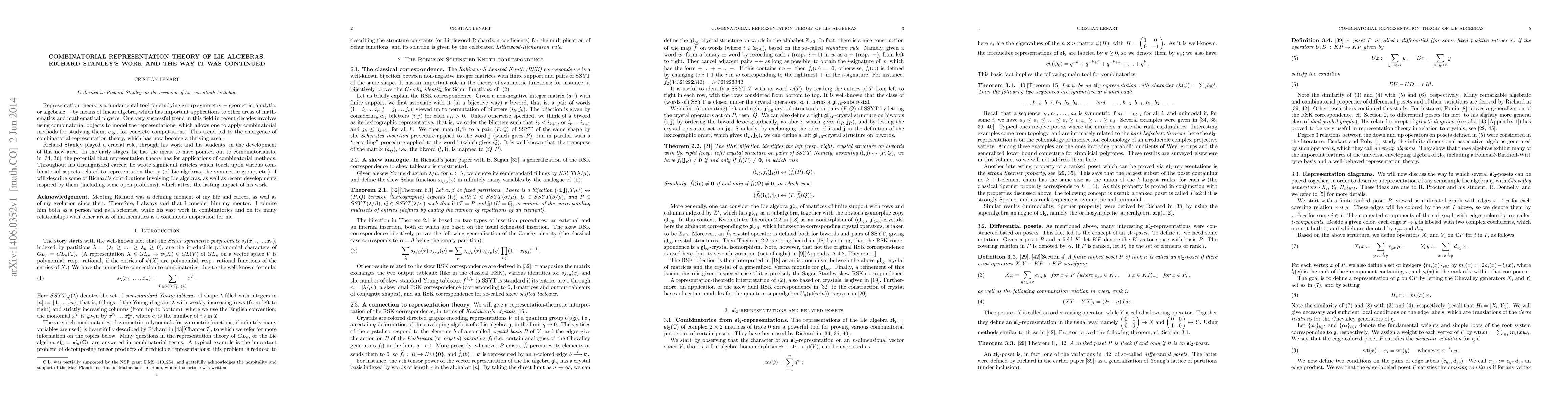 Richard Stanley played a crucial role, through his work and his students, in the development of the relatively new area known as combinatorial representation theory. In the early stages, he has the merit to have pointed out to combinatorialists the potential that representation theory has for applications of combinatorial methods. Throughout his distinguished career, he wrote significant articles which touch upon various combinatorial aspects related to representation theory (of Lie algebras, the symmetric group, etc.). I describe some of Richard's contributions involving Lie algebras, as well as recent developments inspired by them (including some open problems), which attest the lasting impact of his work.