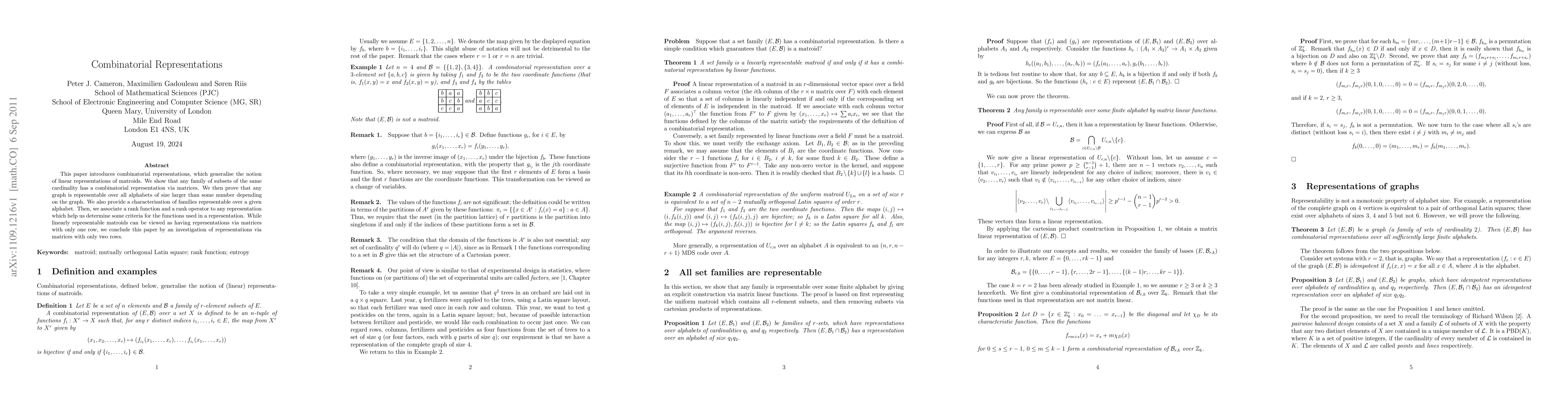 This paper presents combinatorial representations, a generalization of linear matroid representations. It proves any graph can be represented over large enough alphabets and characterizes representable families. The paper also associates rank functions and operators to representations, and explores matrices with only two rows as representations.