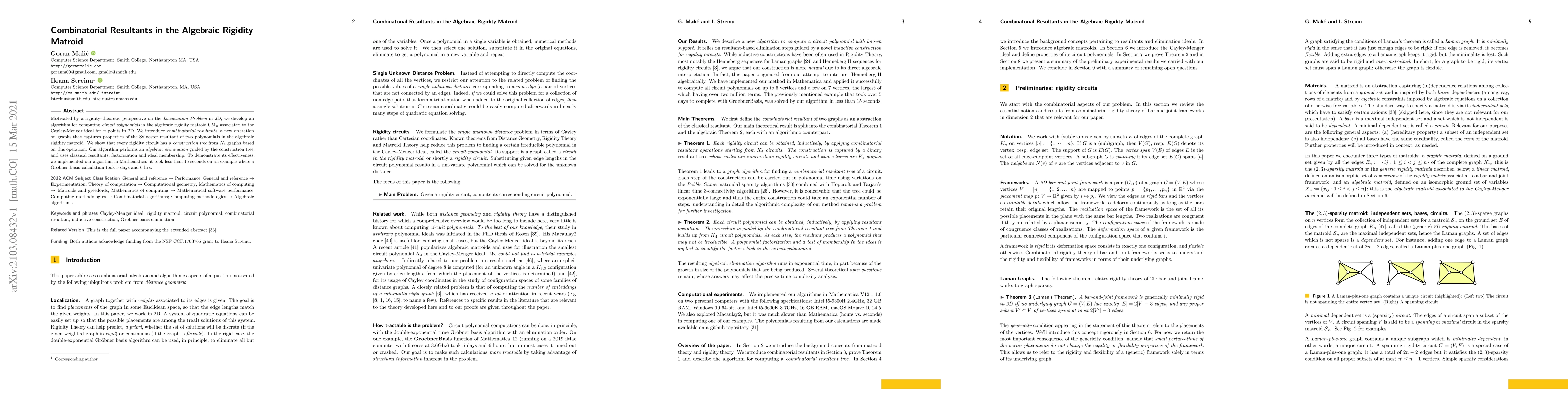 Motivated by a rigidity-theoretic perspective on the Localization Problem in 2D, we develop an algorithm for computing circuit polynomials in the algebraic rigidity matroid associated to the Cayley-Menger ideal for $n$ points in 2D. We introduce combinatorial resultants, a new operation on graphs that captures properties of the Sylvester resultant of two polynomials in the algebraic rigidity matroid. We show that every rigidity circuit has a construction tree from $K_4$ graphs based on this operation. Our algorithm performs an algebraic elimination guided by the construction tree, and uses classical resultants, factorization and ideal membership. To demonstrate its effectiveness, we implemented our algorithm in Mathematica: it took less than 15 seconds on an example where a Groebner Basis calculation took 5 days and 6 hrs.