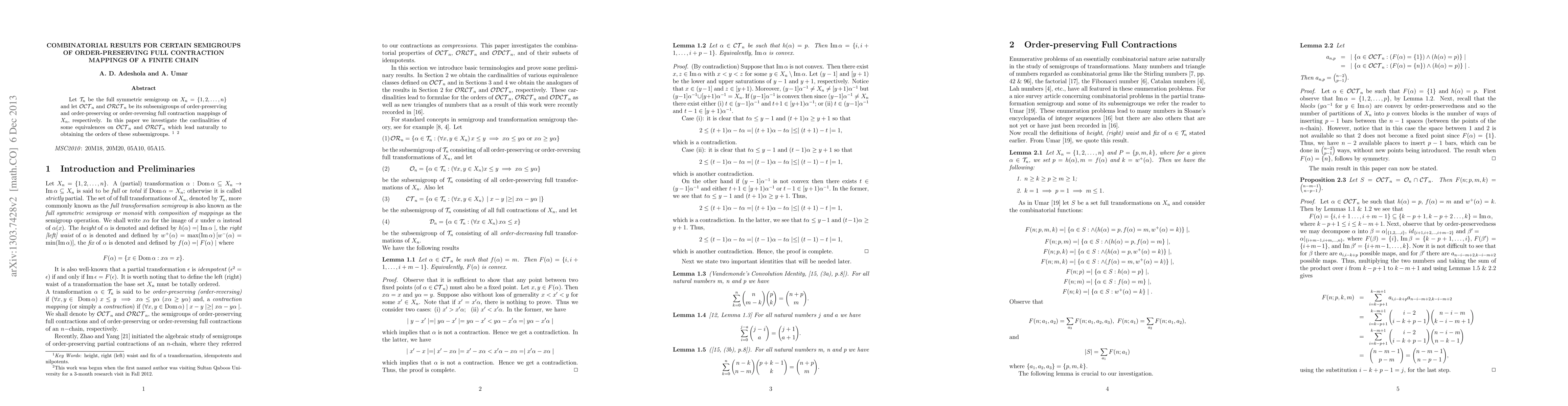 Let ${\cal T}_n$ be the full symmetric semigroup on $X_n = \{1, 2,..., n\}$ and let ${\cal OCT}_n$ and ${\cal ORCT}_n$ be its subsemigroups of order-preserving and order-preserving or order-reversing full contraction mappings of $X_n$, respectively. In this paper we investigate the cardinalities of some equivalences on ${\cal OCT}_n$ and ${\cal ORCT}_n$ which lead naturally to obtaining the orders of these subsemigroups.