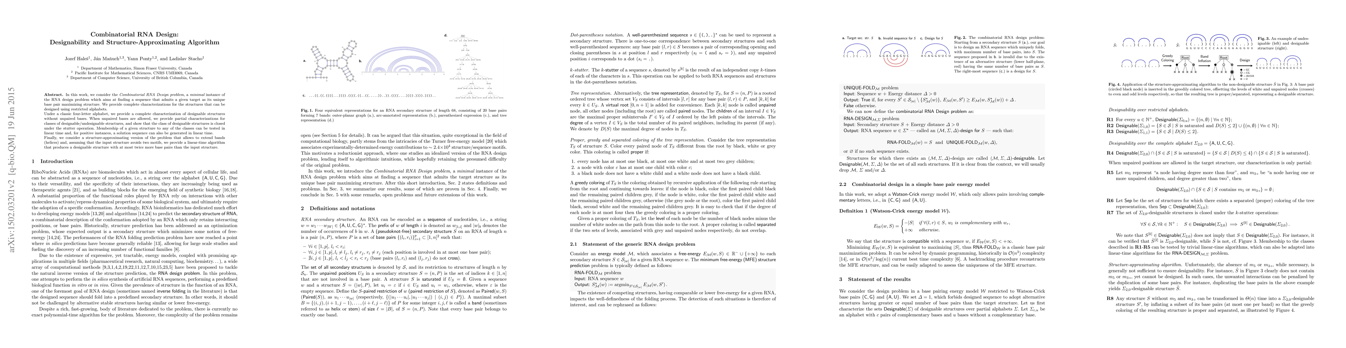In this work, we consider the Combinatorial RNA Design problem, a minimal instance of the RNA design problem which aims at finding a sequence that admits a given target as its unique base pair maximizing structure. We provide complete characterizations for the structures that can be designed using restricted alphabets. Under a classic four-letter alphabet, we provide a complete characterization of designable structures without unpaired bases. When unpaired bases are allowed, we provide partial characterizations for classes of designable/undesignable structures, and show that the class of designable structures is closed under the stutter operation. Membership of a given structure to any of the classes can be tested in linear time and, for positive instances, a solution can be found in linear time. Finally, we consider a structure-approximating version of the problem that allows to extend bands (helices) and, assuming that the input structure avoids two motifs, we provide a linear-time algorithm that produces a designable structure with at most twice more base pairs than the input structure.