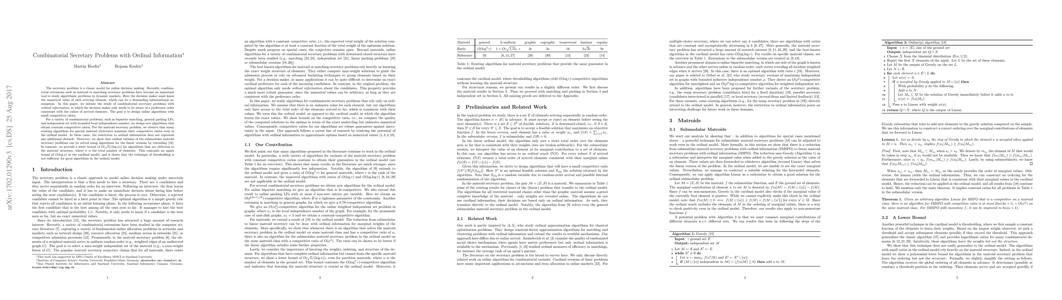 This paper explores combinatorial secretary problems where decision makers only have ordinal information about elements, rather than their numerical values. It designs online algorithms for various problems, such as bipartite matching and matroid structures, achieving constant competitive ratios, while showing that traditional algorithms still work under ordinal constraints and highlighting the limitations of thresholding techniques in this model.