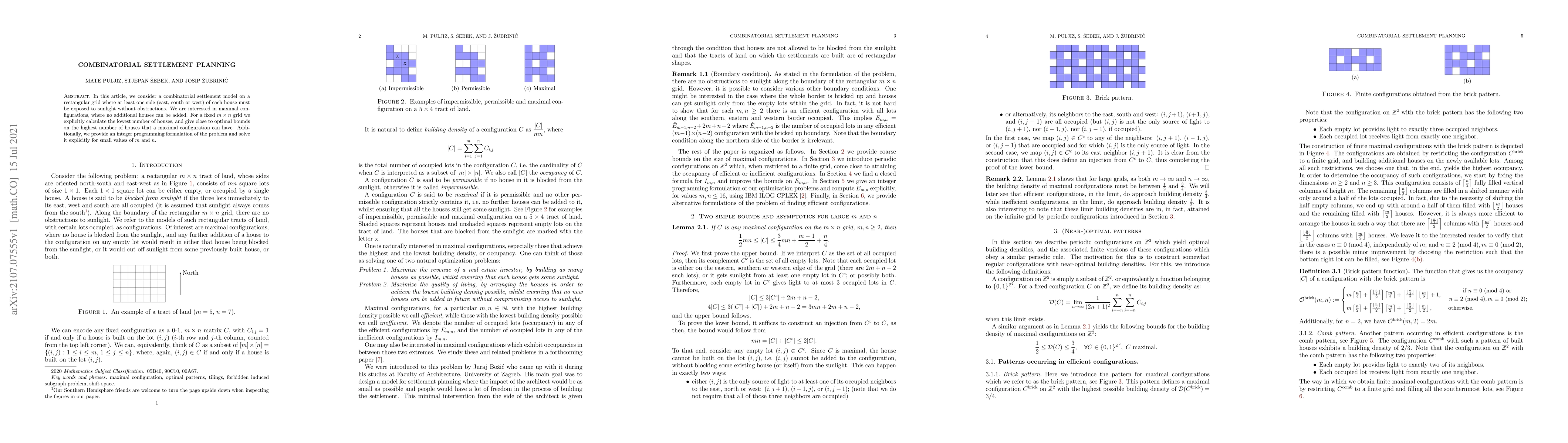 In this article, we consider a combinatorial settlement model on a rectangular grid where at least one side (east, south or west) of each house must be exposed to sunlight without obstructions. We are interested in maximal configurations, where no additional houses can be added. For a fixed $m\times n$ grid we explicitly calculate the lowest number of houses, and give close to optimal bounds on the highest number of houses that a maximal configuration can have. Additionally, we provide an integer programming formulation of the problem and solve it explicitly for small values of $m$ and $n$.