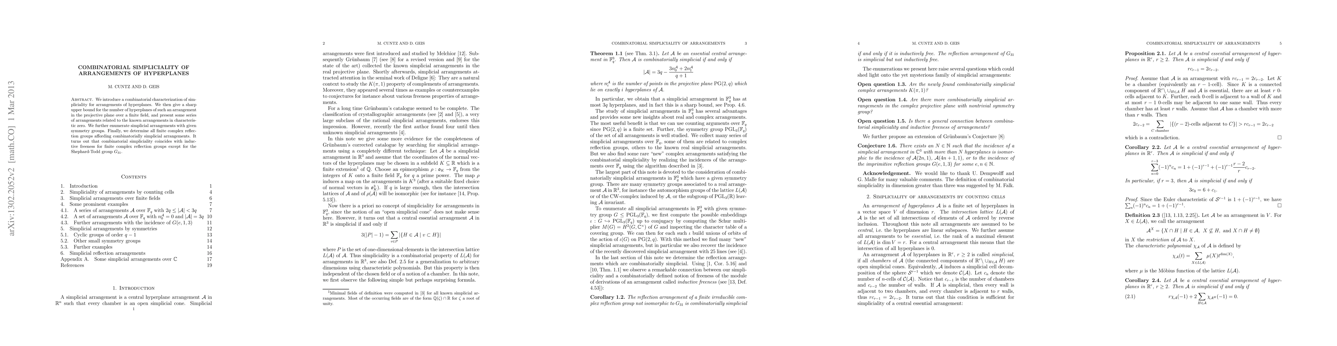 This paper characterizes the combinatorial notion of simpliciality for hyperplane arrangements, establishes an upper bound on the number of hyperplanes in projective planes over finite fields, and enumerates such arrangements with specific symmetry groups. It concludes by identifying all finite complex reflection groups that yield combinatorially simplicial arrangements, excluding the Shephard-Todd group $G_{31}$, where simpliciality differs from inductive freeness.