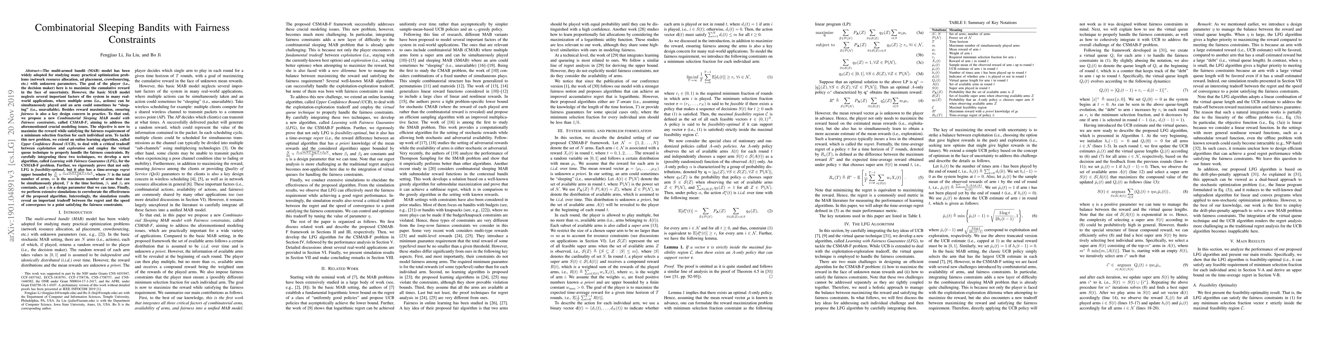 This paper proposes a new Combinatorial Sleeping Multi-Armed Bandit (CSMAB-F) model with fairness constraints to optimize reward in uncertain environments while ensuring each arm is selected a minimum fraction of the time. The developed Learning with Fairness Guarantee (LFG) algorithm balances exploitation and exploration, and is shown to be feasibility-optimal with a bounded time-average regret, validated through simulations highlighting a tradeoff between regret and fairness satisfaction.