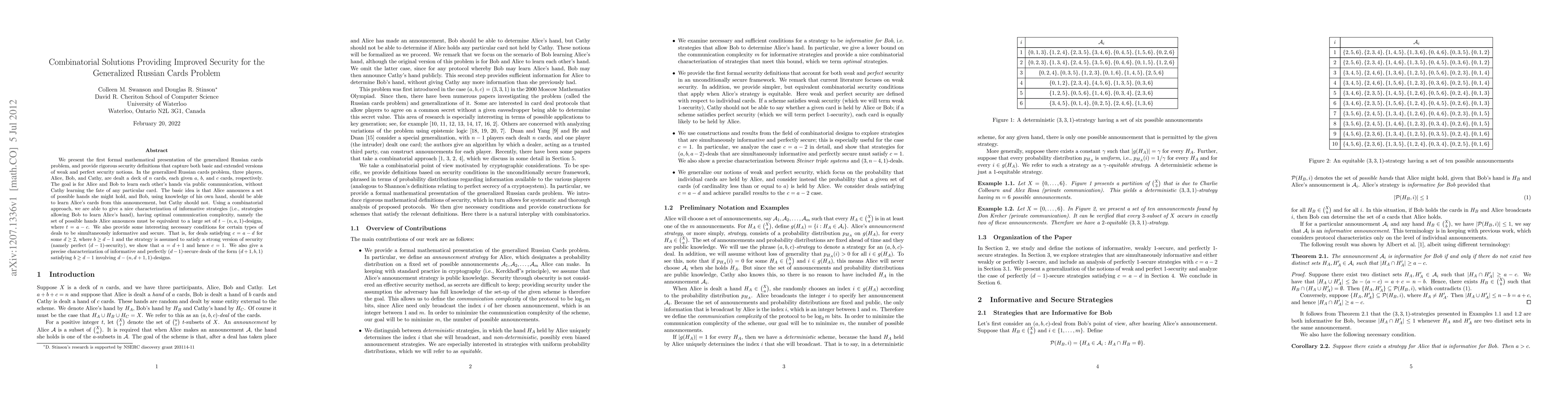 This paper formalizes the generalized Russian cards problem and provides rigorous security definitions for weak and perfect security. It uses combinatorial techniques to characterize optimal communication strategies that allow Alice and Bob to deduce each other's hands without revealing information to Cathy, employing $t-(n, a, 1)$-designs for efficient communication.
