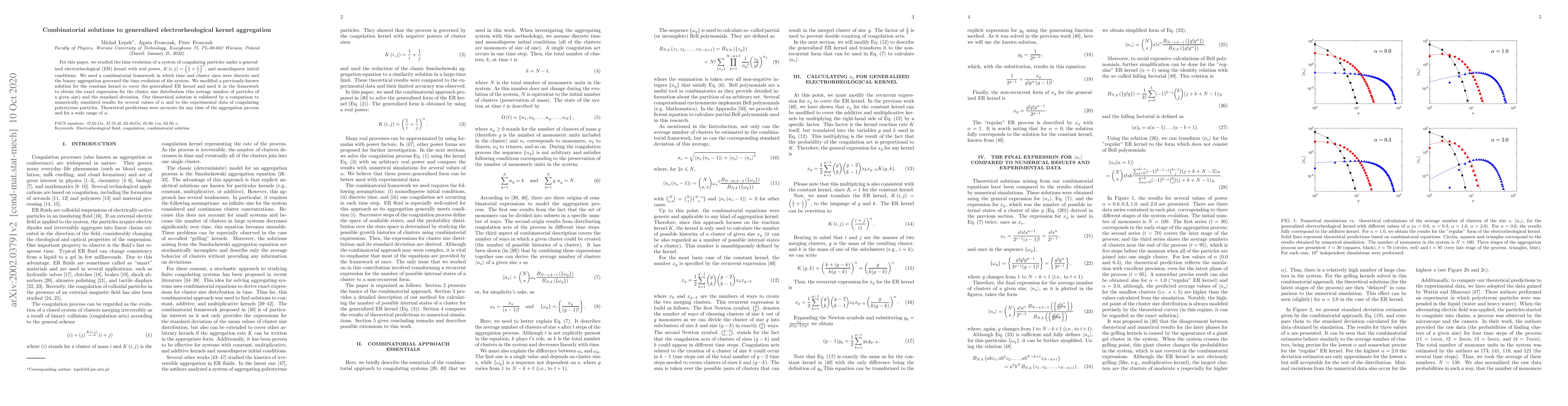 For this paper, we studied the time evolution of a system of coagulating particles under a generalized electrorheological (ER) kernel with real power, $K\left(i,j\right) = \left( \frac{1}{i}+\frac{1}{j} \right)^\alpha$, and monodisperse initial conditions. We used a combinatorial framework in which time and cluster sizes were discrete and the binary aggregation governed the time evolution of the system. We modified a previously-known solution for the constant kernel to cover the generalized ER kernel and used it in the framework to obtain the exact expression for the cluster size distribution (the average number of particles of a given size) and the standard deviation. Our theoretical solution is validated by a comparison to numerically simulated results for several values of $\alpha$ and to the experimental data of coagulating polystyrene particles. Theoretical predictions were accurate for any time of the aggregation process and for a wide range of $\alpha$.