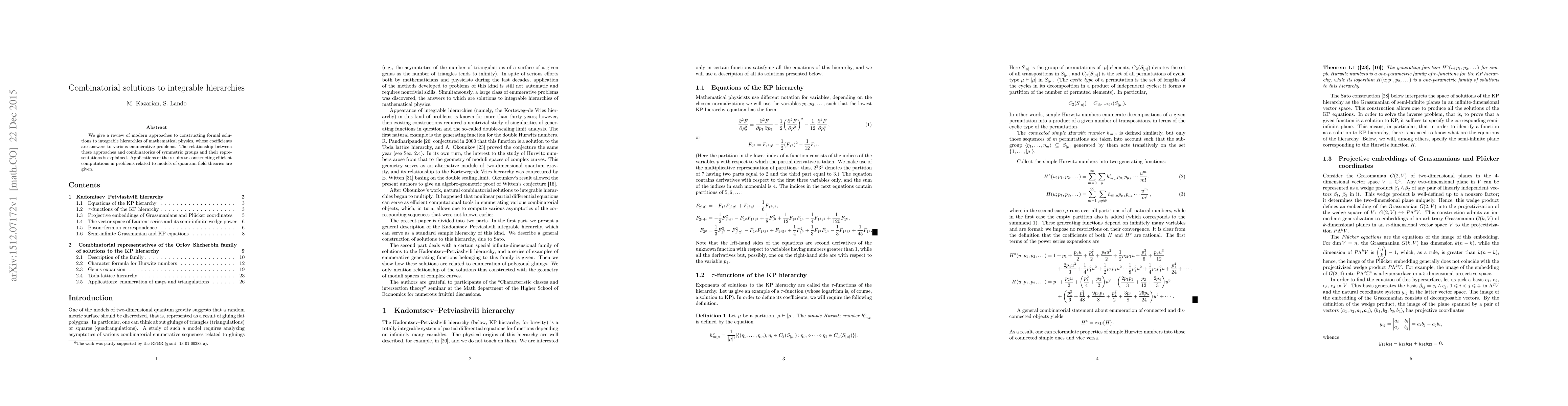 This paper reviews modern methods for constructing formal solutions to integrable hierarchies in mathematical physics, linking these methods to the combinatorics of symmetric groups and their representations. It also demonstrates applications in efficient computations for quantum field theory models.