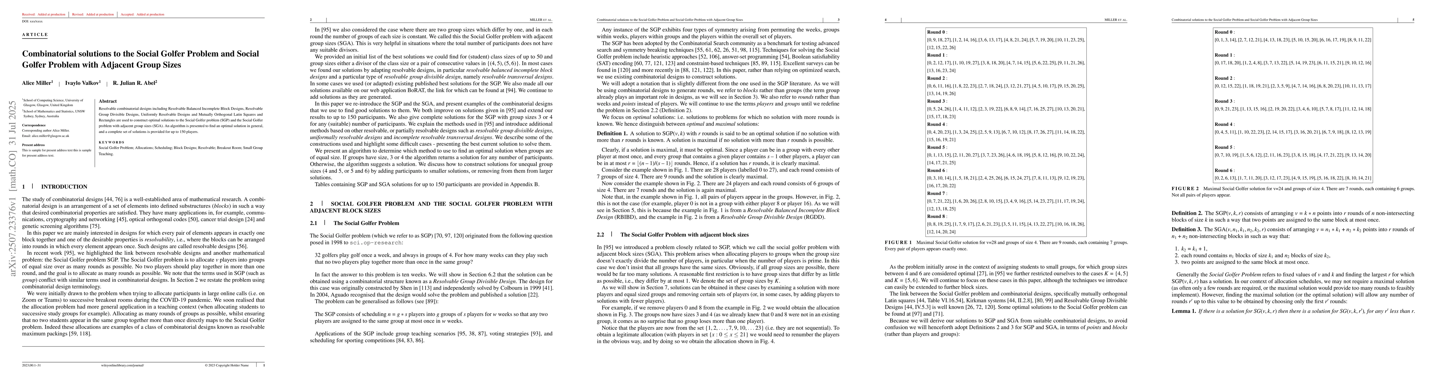 Resolvable combinatorial designs including Resolvable Balanced Incomplete Block Designs, Resolvable Group Divisible Designs, Uniformly Resolvable Designs and Mutually Orthogonal Latin Squares and Rectangles are used to construct optimal solutions to the Social Golfer problem (SGP) and the Social Golfer problem with adjacent group sizes (SGA). An algorithm is presented to find an optimal solution in general, and a complete set of solutions is provided for up to 150 players.