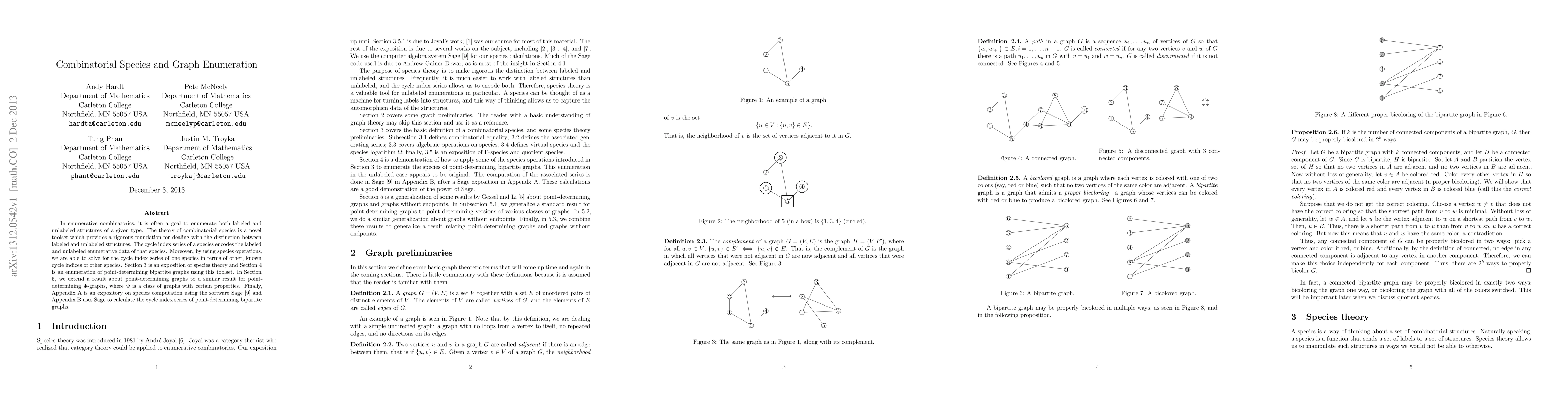 This paper explores the theory of combinatorial species to distinguish between labeled and unlabeled structures in enumerative combinatorics. It applies species operations and cycle index series to enumerate point-determining bipartite graphs and extends results to point-determining Φ-graphs, with appendices detailing species computation using Sage software.