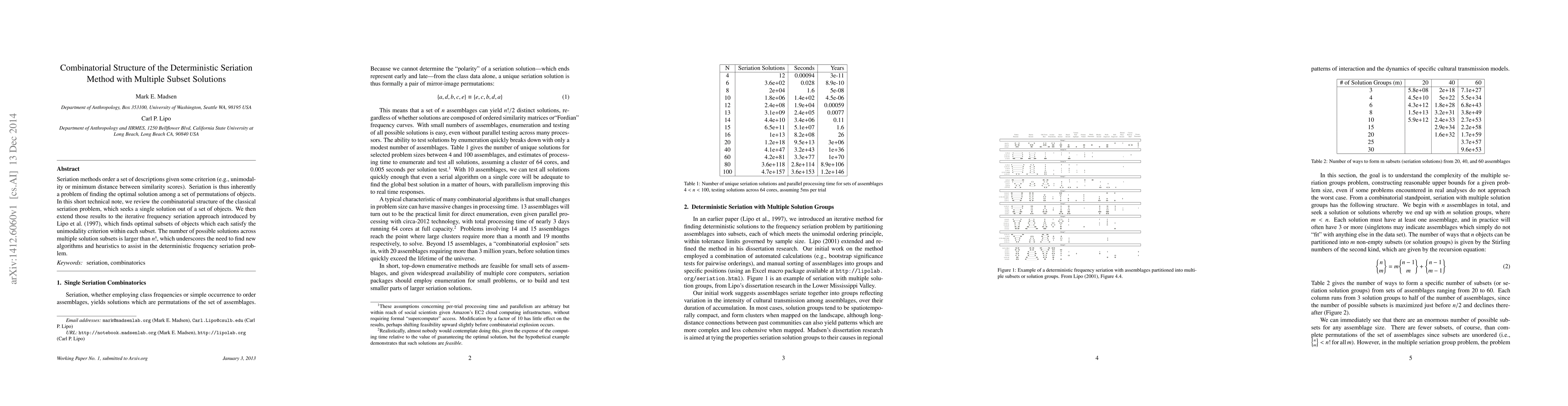 Seriation methods order a set of descriptions given some criterion (e.g., unimodality or minimum distance between similarity scores). Seriation is thus inherently a problem of finding the optimal solution among a set of permutations of objects. In this short technical note, we review the combinatorial structure of the classical seriation problem, which seeks a single solution out of a set of objects. We then extend those results to the iterative frequency seriation approach introduced by Lipo (1997), which finds optimal subsets of objects which each satisfy the unimodality criterion within each subset. The number of possible solutions across multiple solution subsets is larger than $n!$, which underscores the need to find new algorithms and heuristics to assist in the deterministic frequency seriation problem.