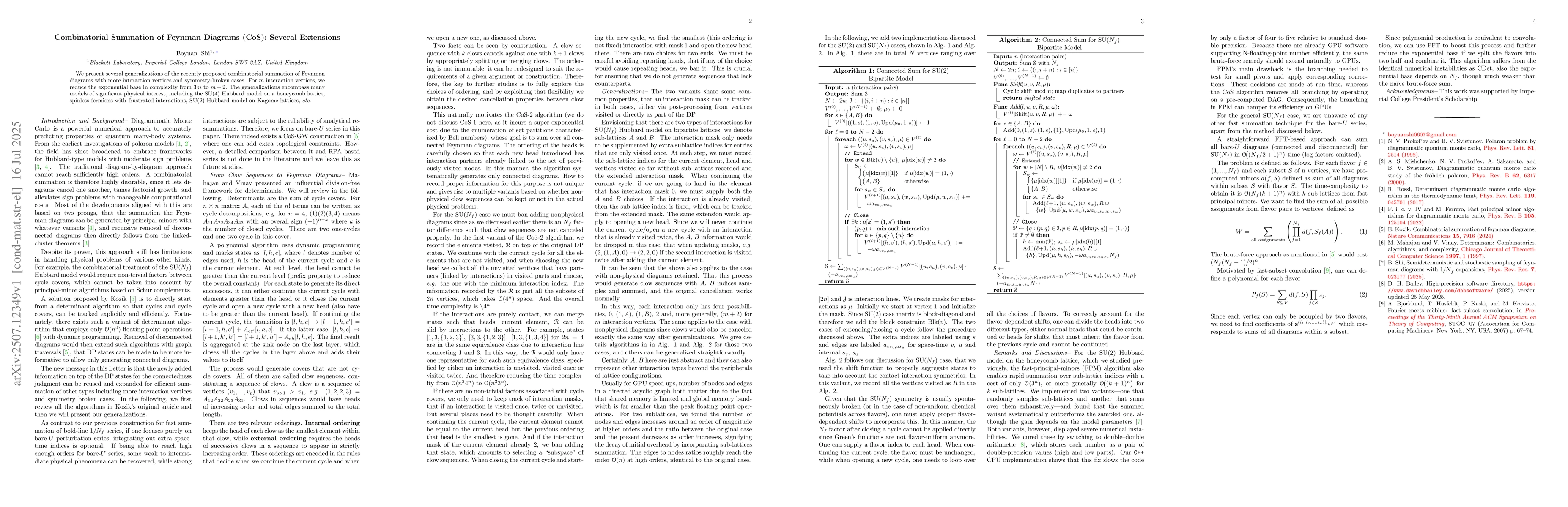 We present several generalizations of the recently proposed combinatorial summation of Feynman diagrams with more interaction vertices and symmetry-broken cases. For $m$ interaction vertices, we reduce the exponential base in complexity from $3m$ to $m+2$. The generalizations encompass many models of significant physical interest, including the SU(4) Hubbard model on a honeycomb lattice, spinless fermions with frustrated interactions, SU(2) Hubbard model on Kagome lattices, \textit{etc}.