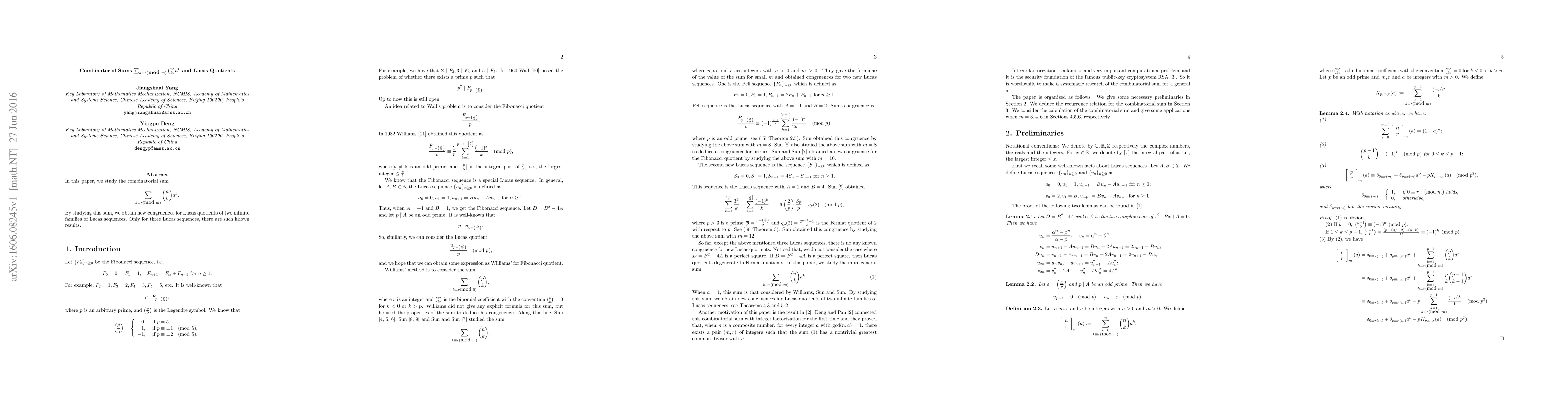 In this paper, we study the combinatorial sum $$\sum_{k\equiv r(\mbox{mod }m)}{n\choose k}a^k.$$ By studying this sum, we obtain new congruences for Lucas quotients of two infinite families of Lucas sequences. Only for three Lucas sequences, there are such known results.