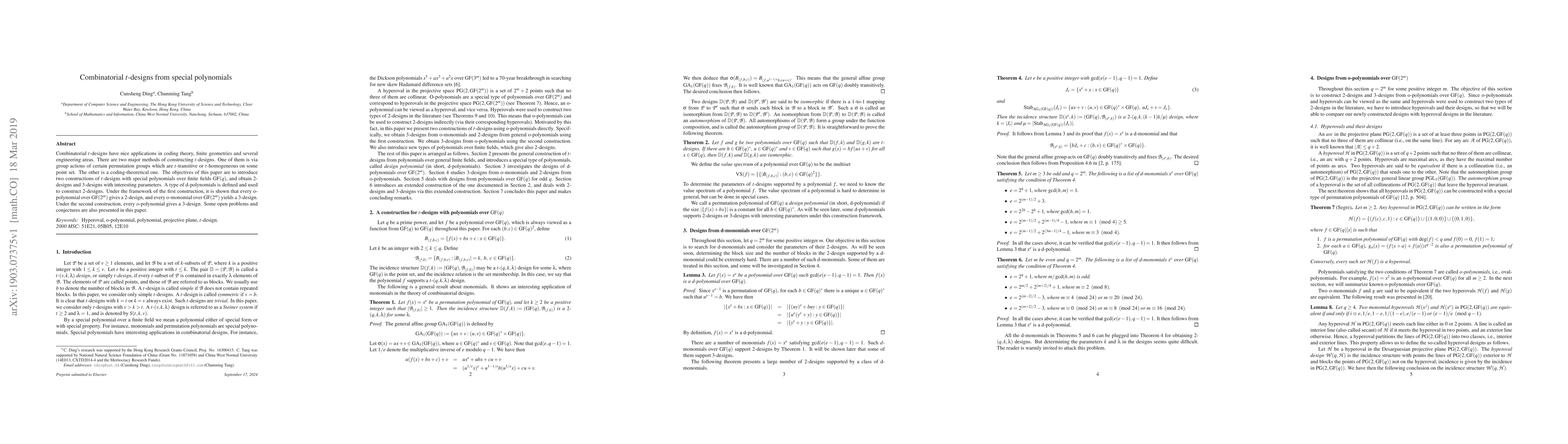 This paper introduces two constructions of combinatorial $t$-designs using special polynomials over finite fields, achieving $2$-designs and $3$-designs with notable parameters. It defines d-polynomials for $2$-designs and demonstrates the efficacy of o-polynomials and o-monomials for $2$- and $3$-designs, respectively.