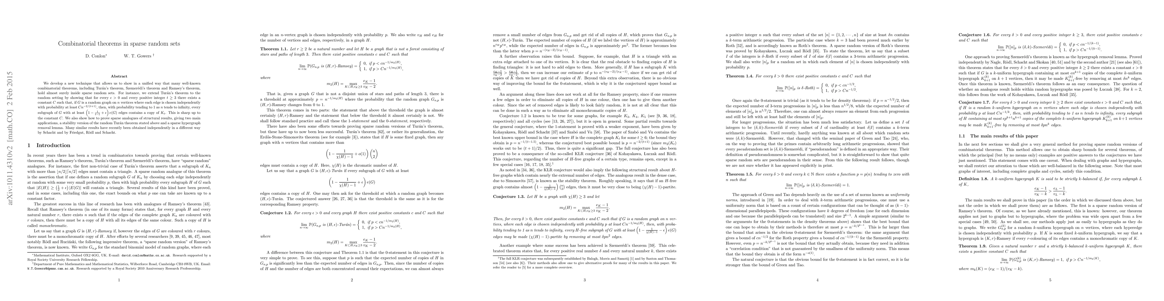 We develop a new technique that allows us to show in a unified way that many well-known combinatorial theorems, including Tur\'an's theorem, Szemer\'edi's theorem and Ramsey's theorem, hold almost surely inside sparse random sets. For instance, we extend Tur\'an's theorem to the random setting by showing that for every $\epsilon > 0$ and every positive integer $t \geq 3$ there exists a constant $C$ such that, if $G$ is a random graph on $n$ vertices where each edge is chosen independently with probability at least $C n^{-2/(t+1)}$, then, with probability tending to $1$ as $n$ tends to infinity, every subgraph of $G$ with at least $(1 - \frac{1}{t-1} + \epsilon) e(G)$ edges contains a copy of $K_t$. This is sharp up to the constant $C$. We also show how to prove sparse analogues of structural results, giving two main applications, a stability version of the random Tur\'an theorem stated above and a sparse hypergraph removal lemma. Many similar results have recently been obtained independently in a different way by Schacht and by Friedgut, R\"odl and Schacht.