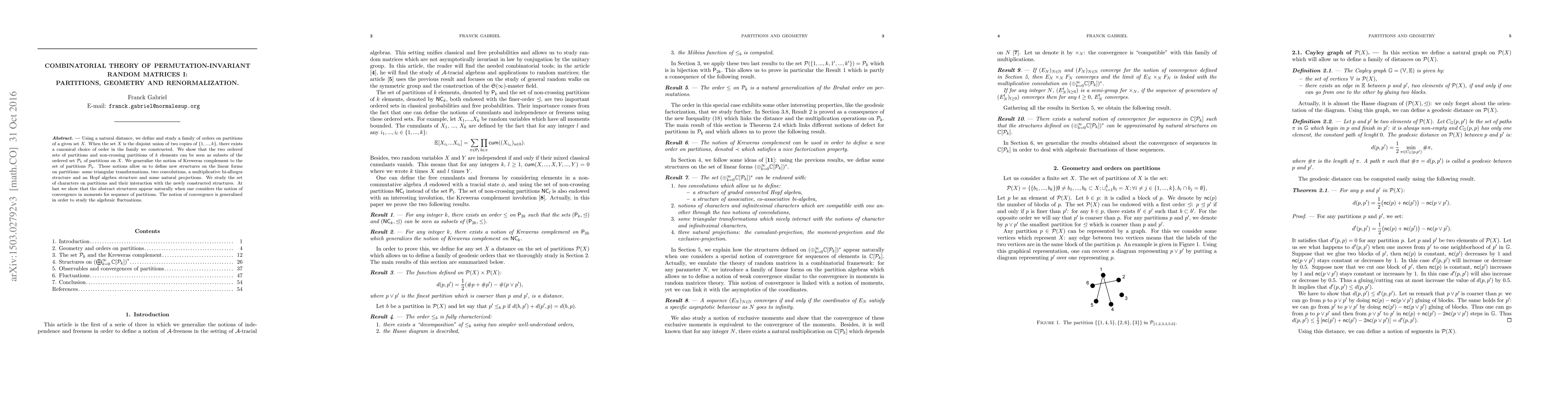 Researchers develop a combinatorial theory for permutation-invariant random matrices, introducing a geometry and order on partitions and studying their convergence as N approaches infinity, leading to new insights into algebraic fluctuations and combinatorial properties.