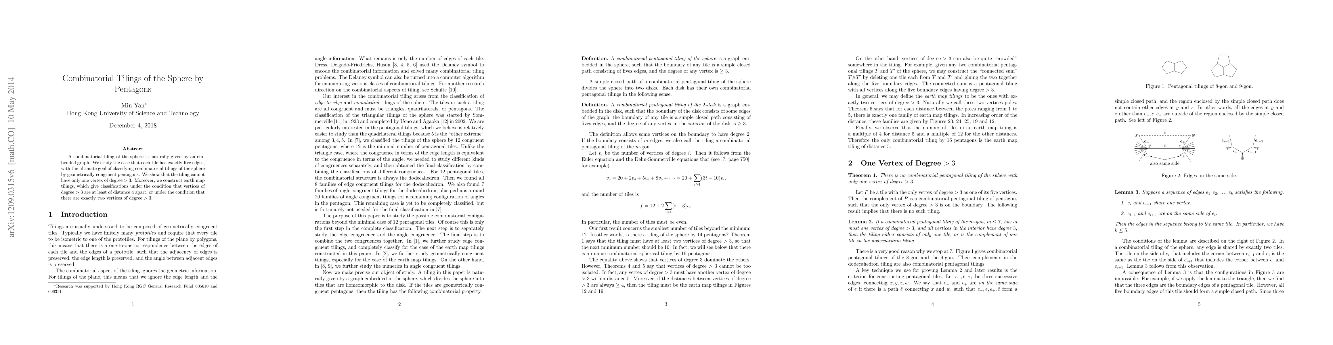 This paper explores combinatorial tilings of the sphere using pentagons, proving that such a tiling cannot have a single vertex of degree greater than 3. It also constructs "earth map tilings" to classify configurations where vertices of higher degree are sufficiently distant or limited in number.